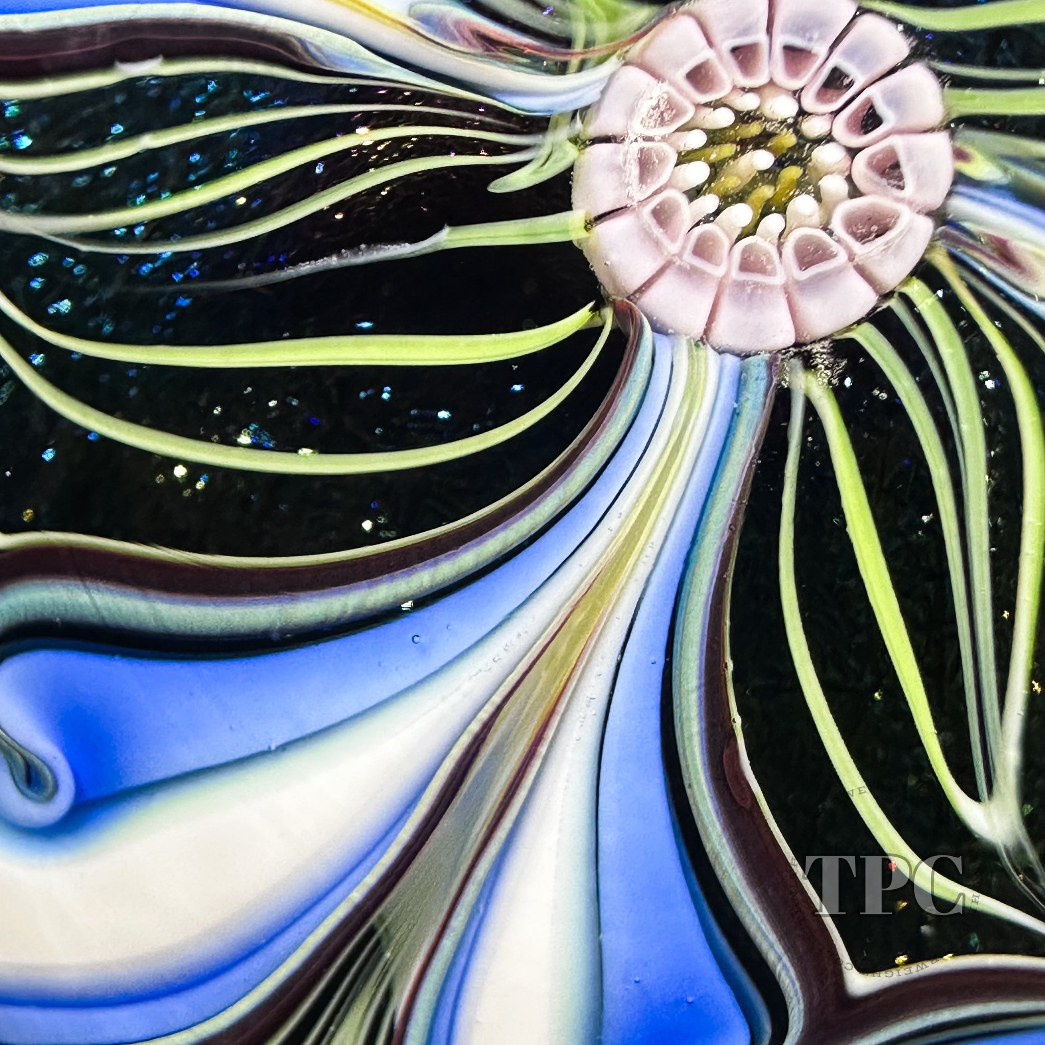 A fine art nouveau style design with surface decorated threading over an dichroic core colored topped with a single complex millefiori at the crown.