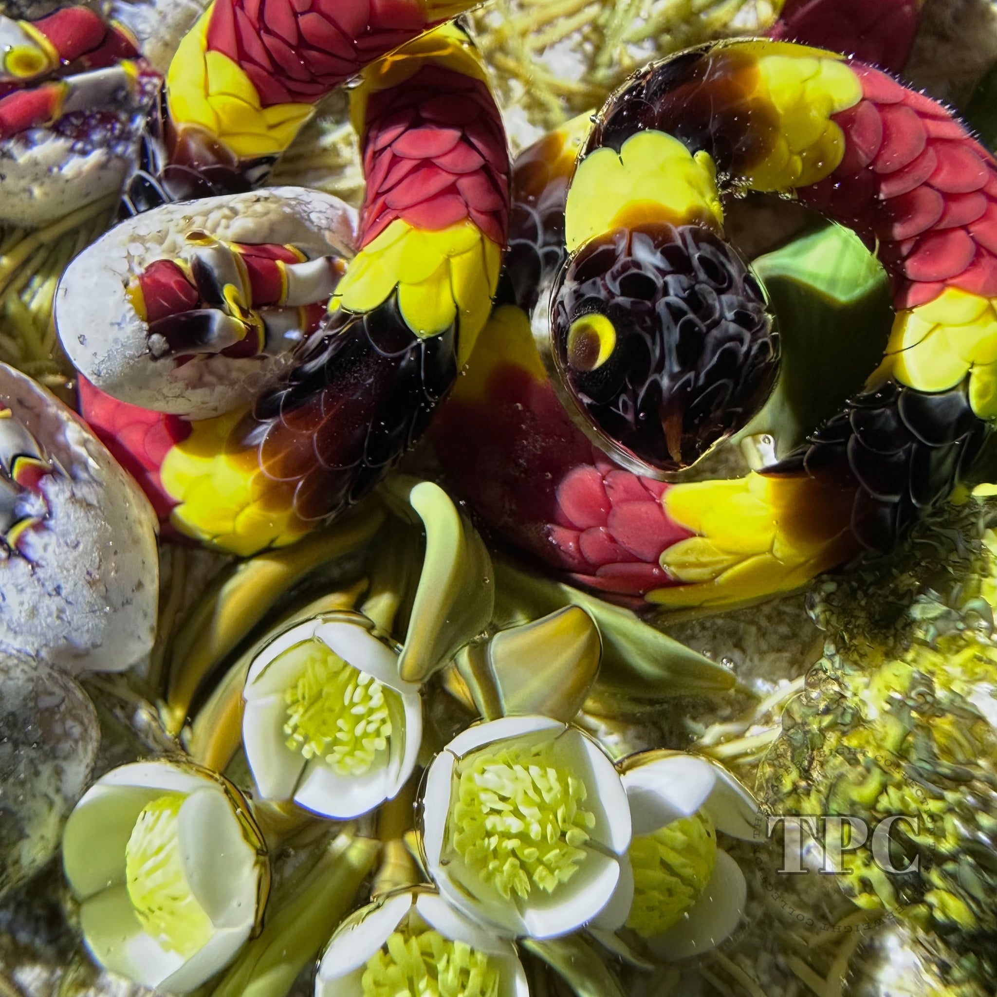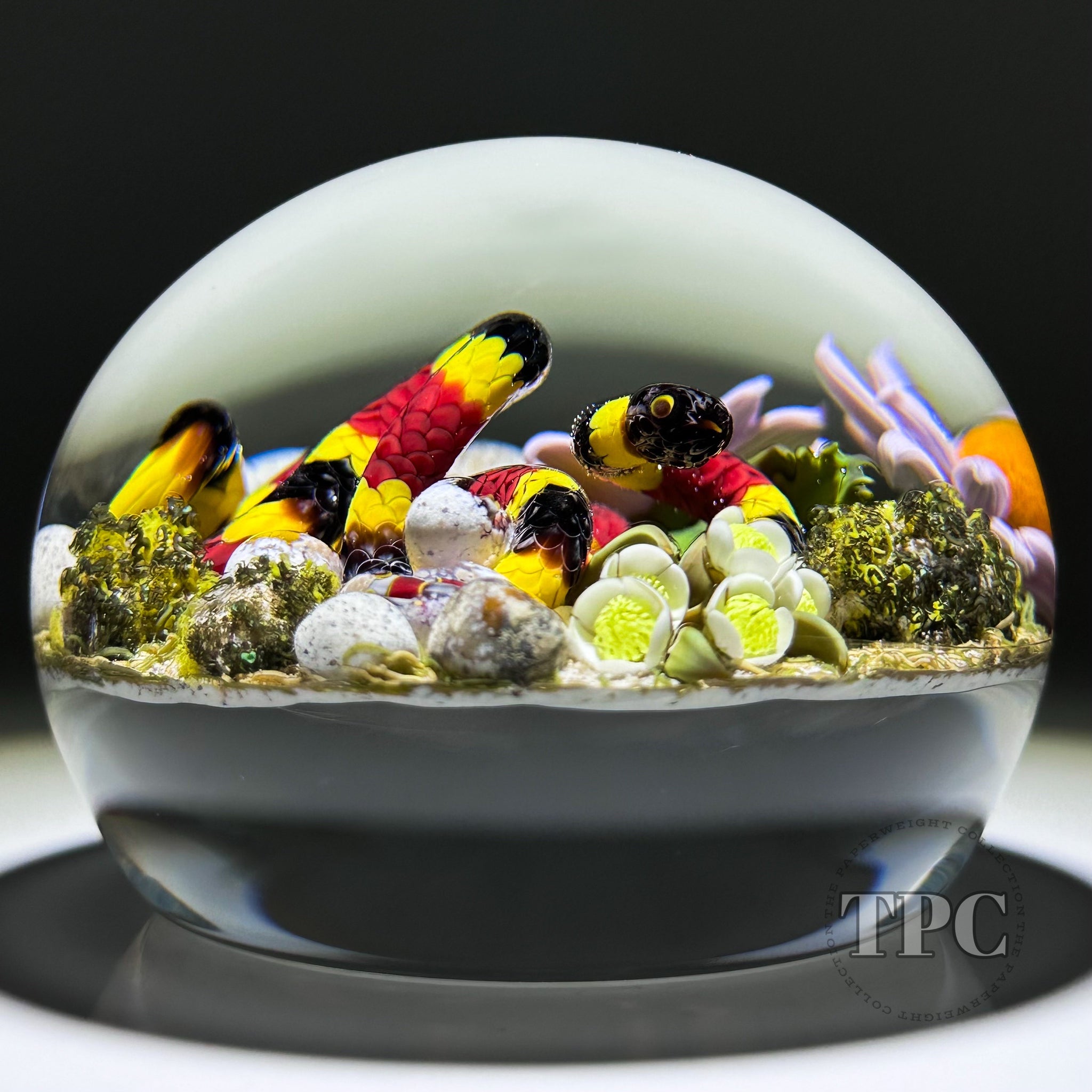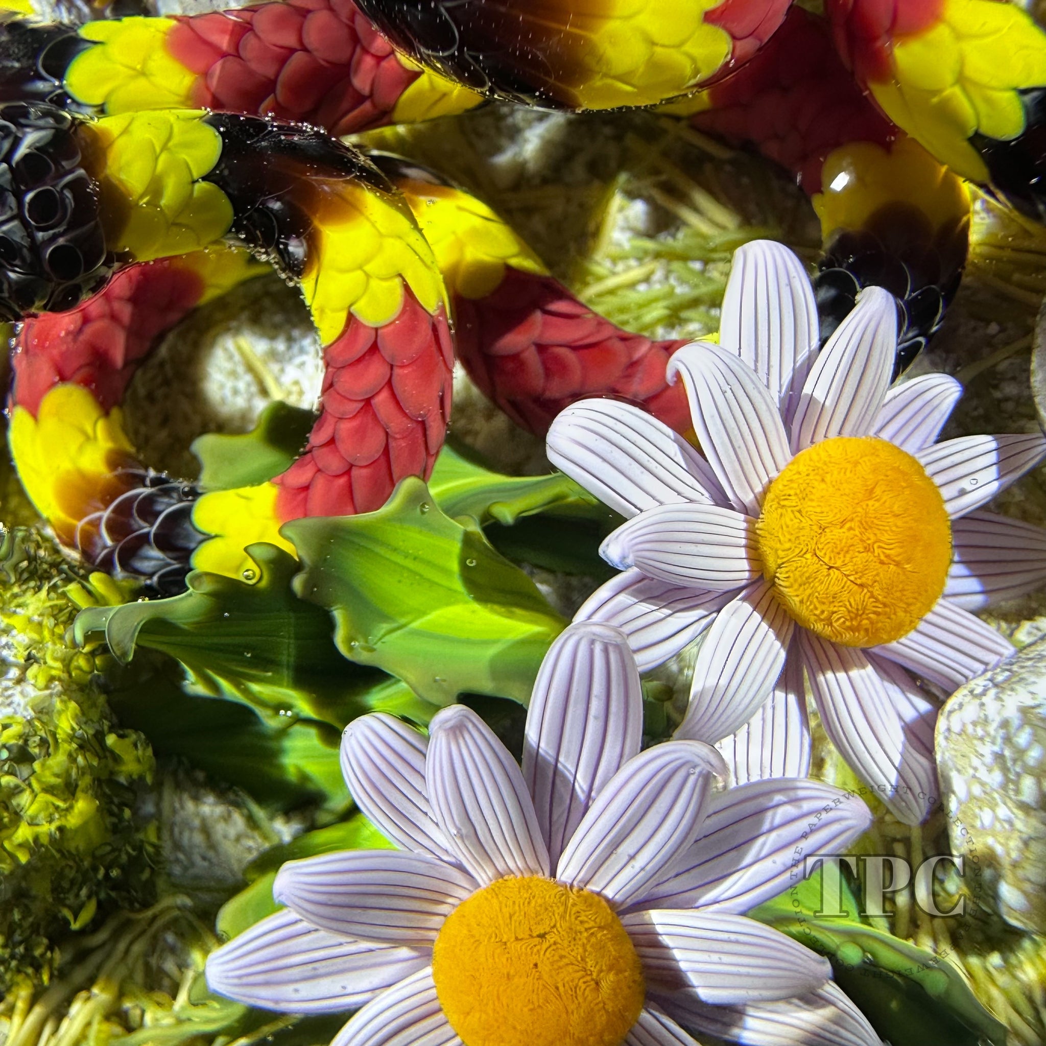 Gordon Smith 2024 Glass Art Paperweight Flamework Coral Snake with Eggs Daisies & Lichen Covered Rocks