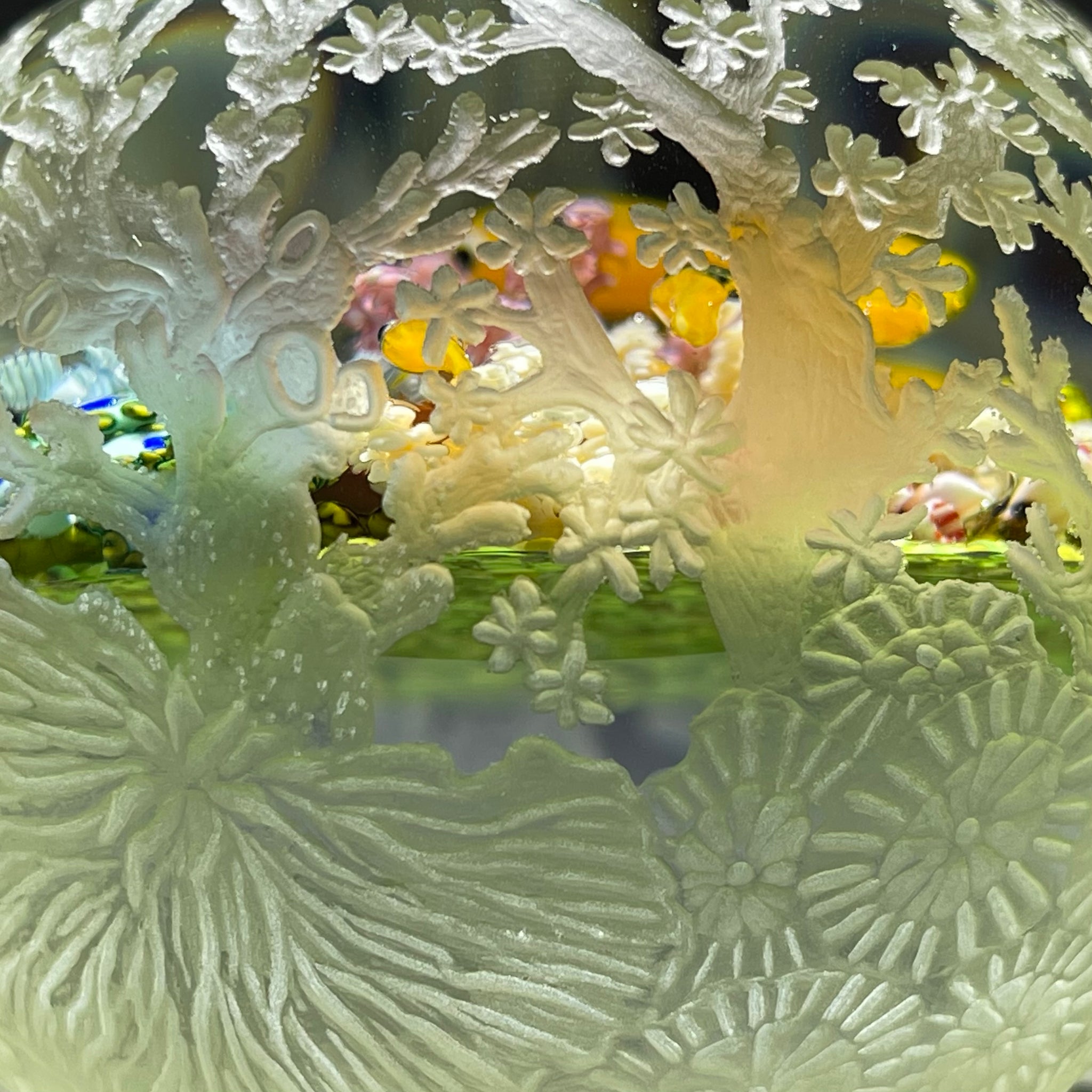 A school of six orange tropical fish explore a detailed flamework reef featuring various types of realistic corals with vivid colors having great dimension and detailed textures. Though the flamework is beautiful the "star of the show" is clearly the all-over hand engraved surface. Numerous species of corals are depicted on the surface with finely carved details at every turn. When held, the carved surface has a wonderful feel and one really gets a sense of the time, patience and talent the work required. As one explores the piece the surface engraving frames elements of the internal flamework at times hiding and then exposing details of the internal coral and fish in great drama. With the heft of the paperweight form we sometimes forget about the true delicate nature of the sculpture within but in some odd way the very fine details of the surface engraving remind the viewer just how delicate this work really is.