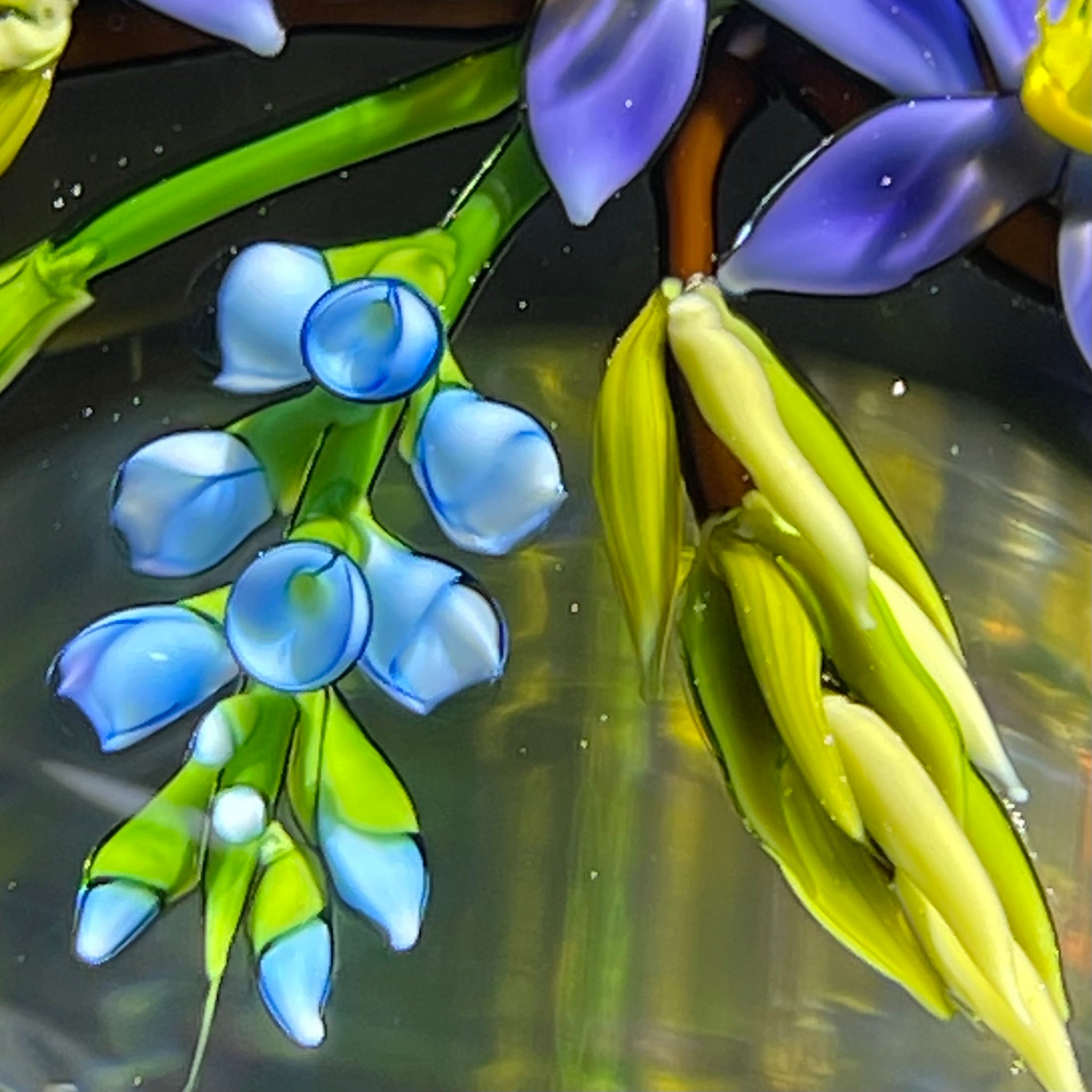 A thoughtful gathering of wild grasses, with narrow green leaves, pink, blue, and purple blossoms set over a clear ground. Buzzini's flamework is flawless with great attention to detail and stylistically executed.
