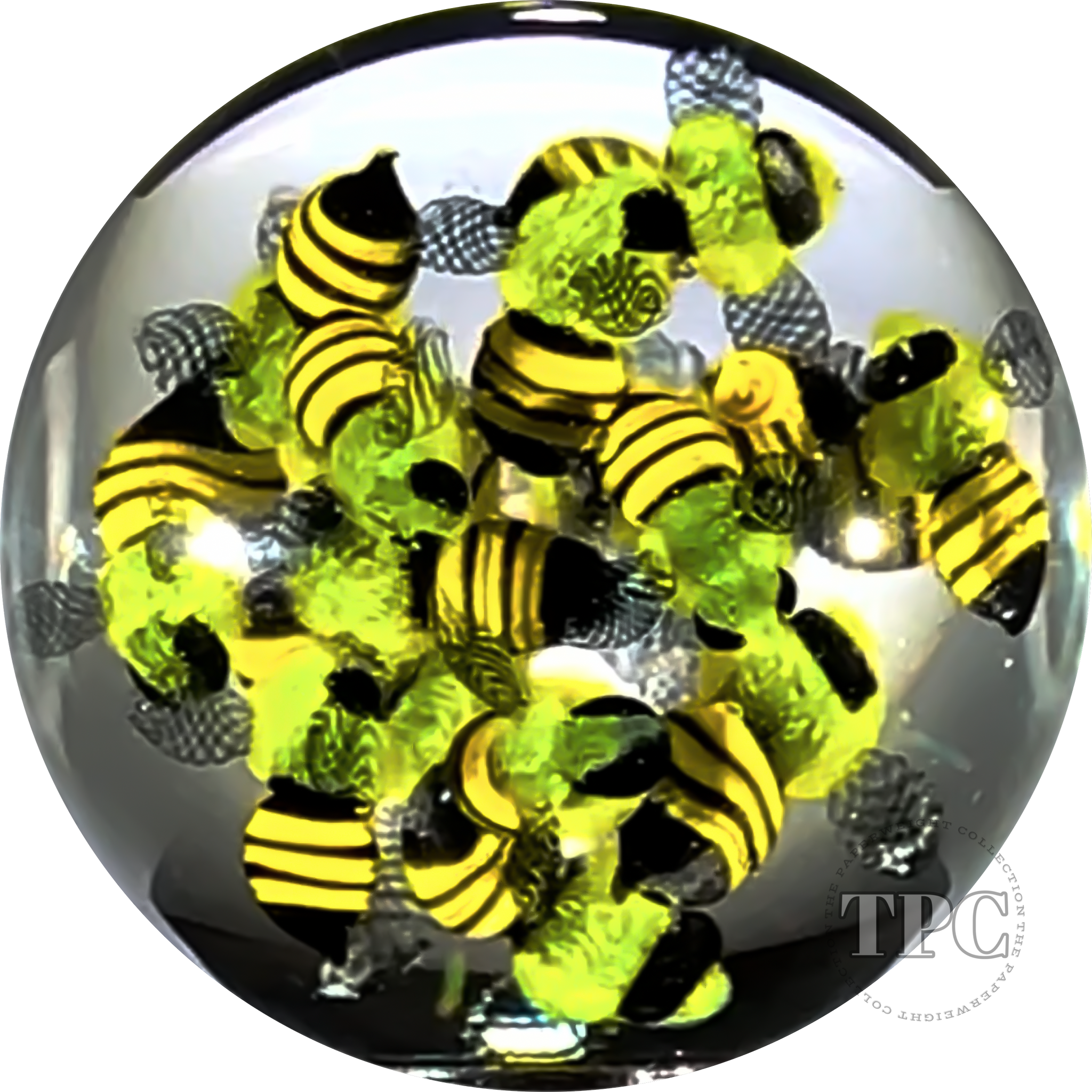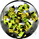 This double sided marble features two paperweight style encased flamework setups creating an all-over full 360 ° swarm of detailed yellow and black honeybees.