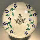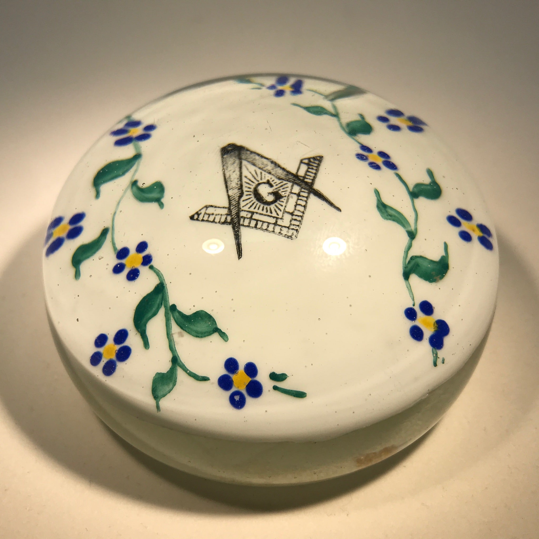 An encased white plaque with the Freemason's symbol in black at the center, accentuated by detailed hand-painted floral garlands to the left and right.