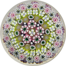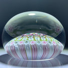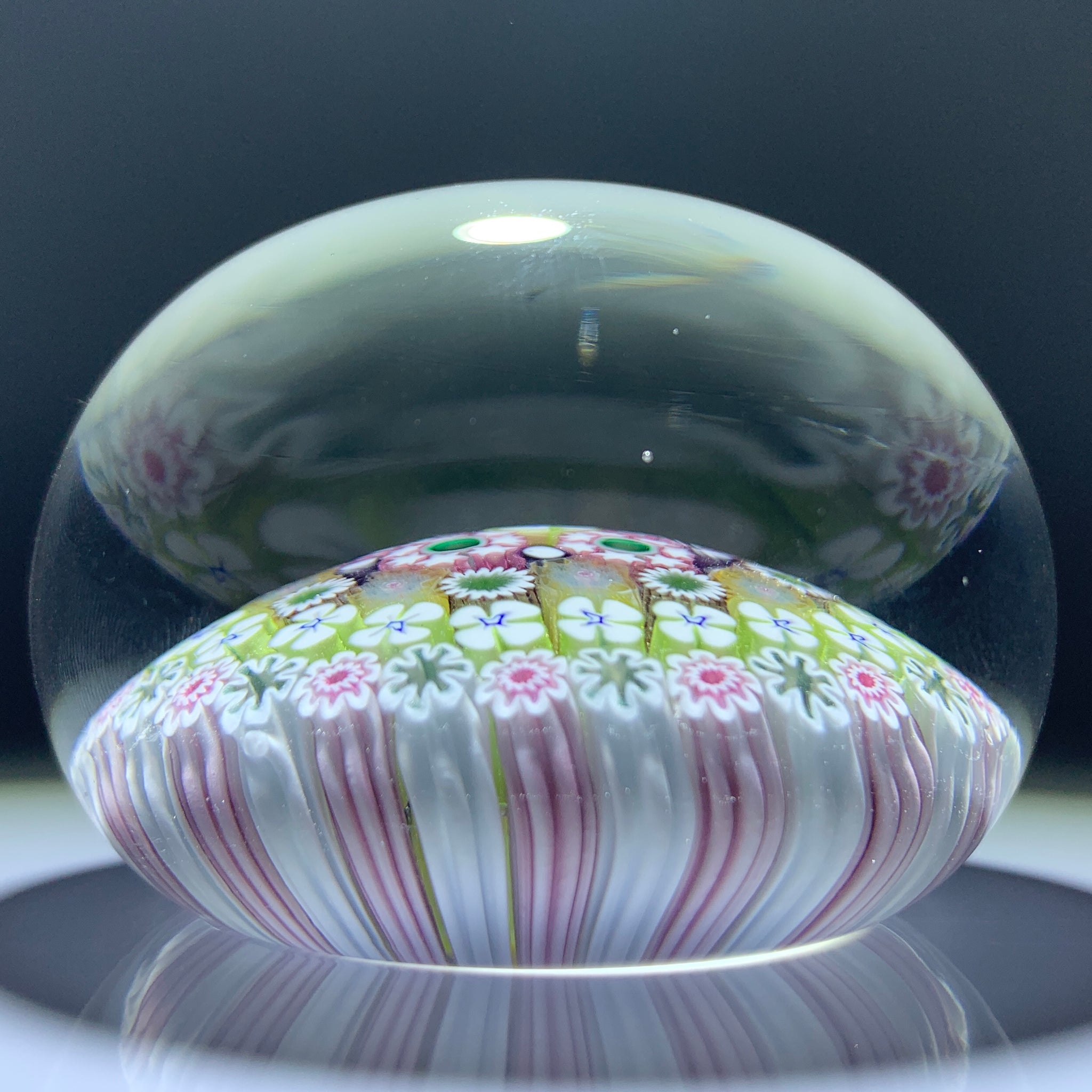 This example features the complexity, aesthetic appeal, and the detail for which MacNaught has been celebrated, with four rows of canes alternating complex, simple, and tube canes in a complex concentric pattern. The choice in color is subtle but effective and when viewed, the eye wanders, exploring the intricate patterns of the overall setup and finally to the individual canes. The outer row of canes is pulled to the base forming a cupped stave basket. To learn more about Damon please watch Pondering Paperweights Episode 2.