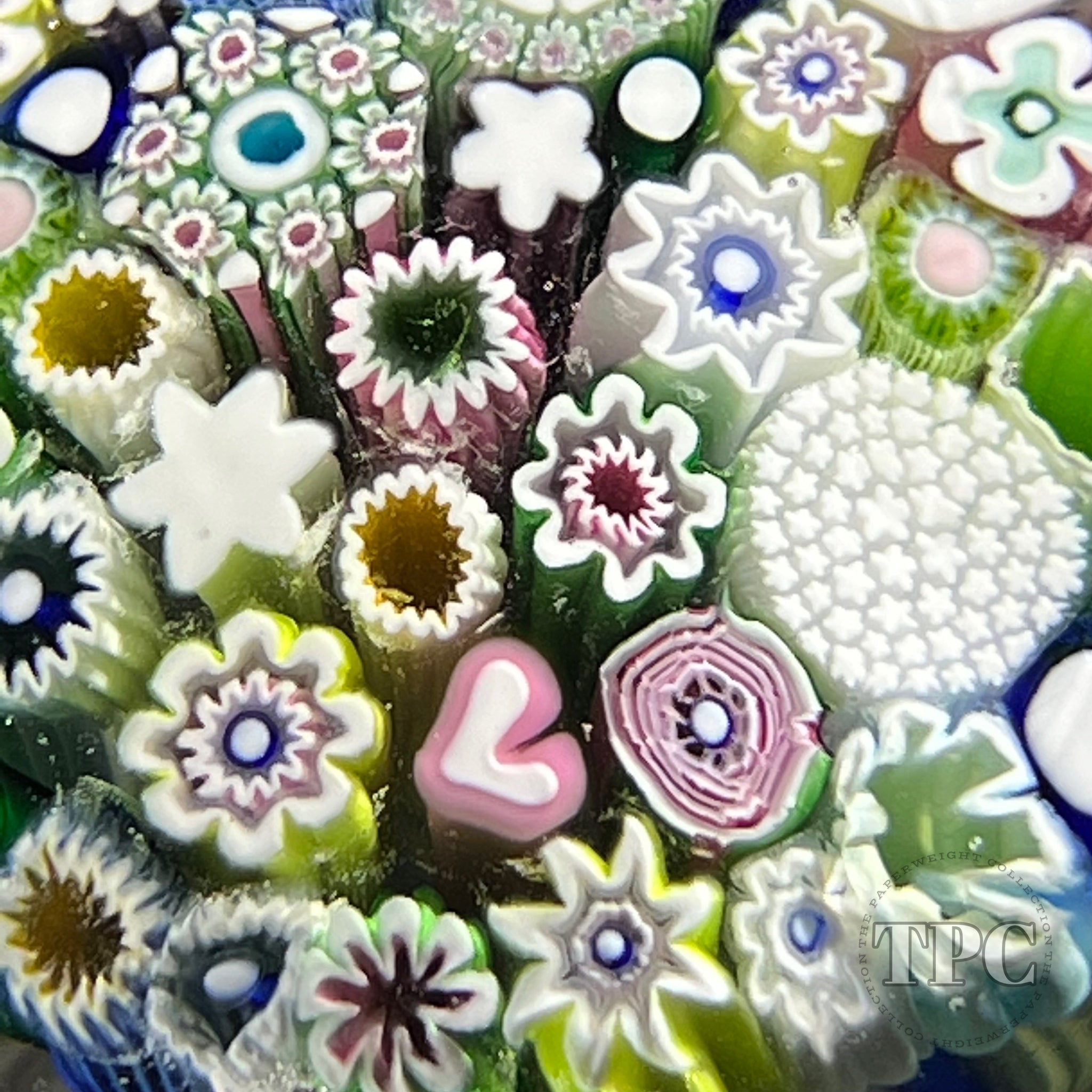 An excellent example with on overall spring color palette, featuring complex millefiori in shades of green, pink and blue. Included in the setup is a pig silhouette cane, a heart, dogwood blossoms and rose canes. The outer row of millefiori forms a stave basket with the canes drawn neatly to the base.