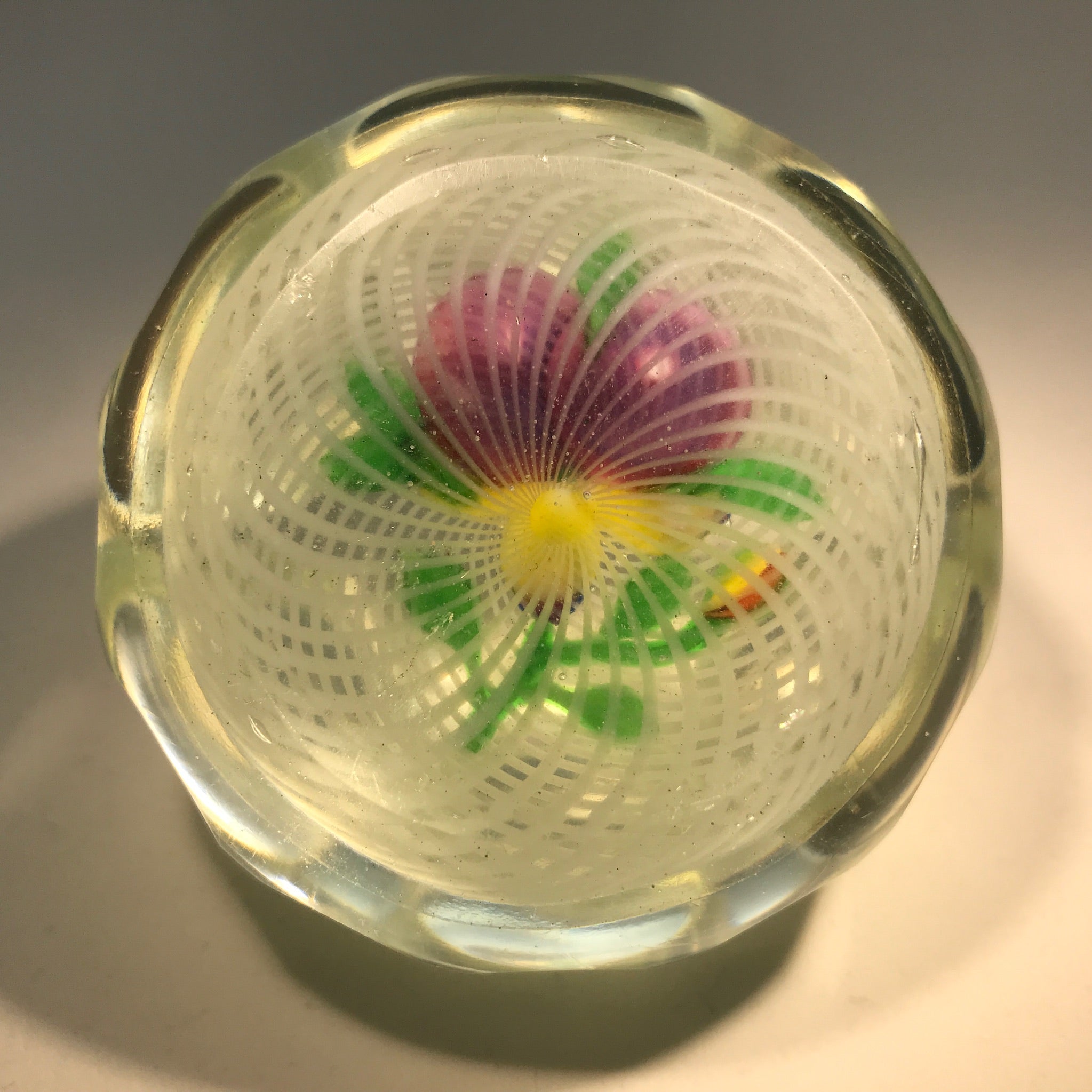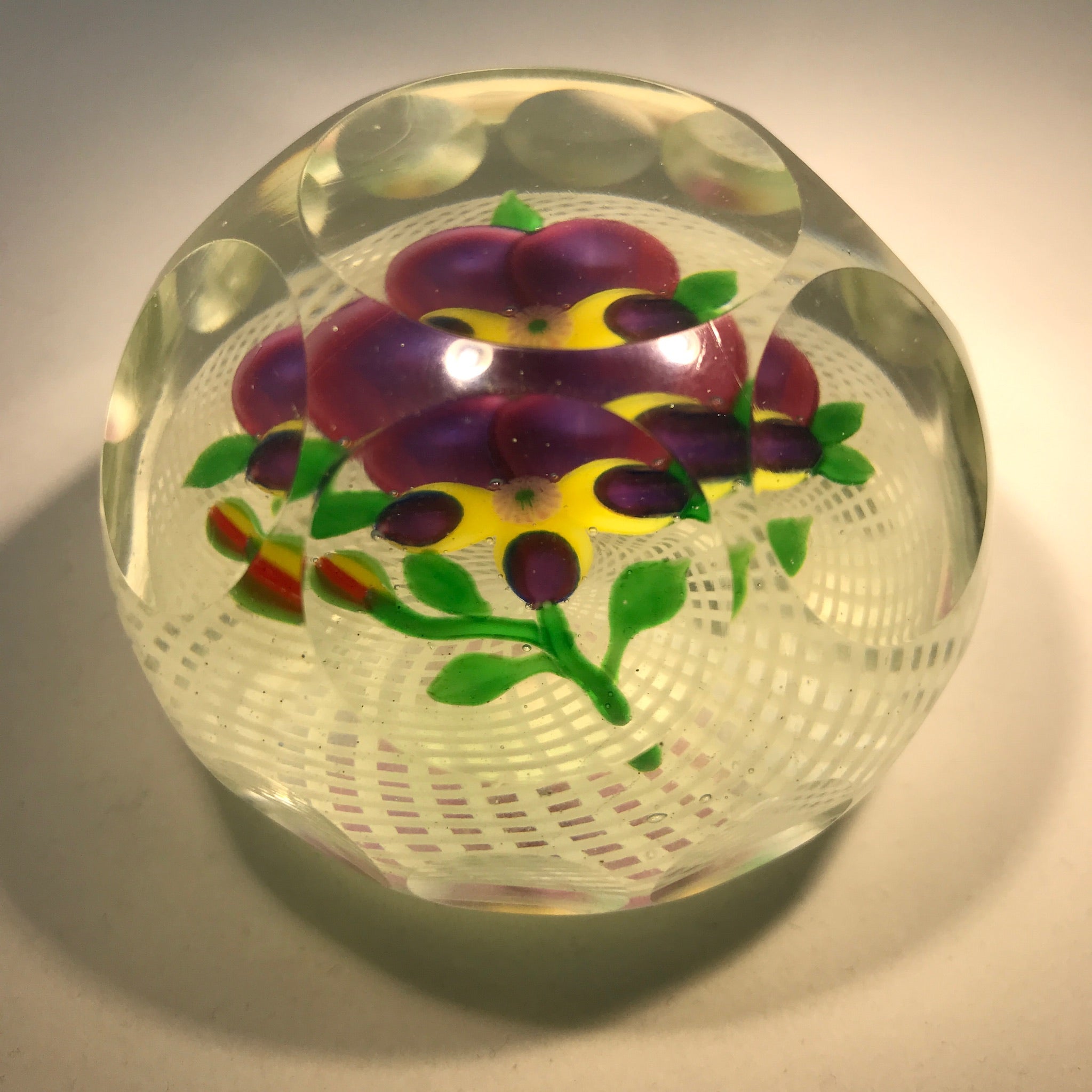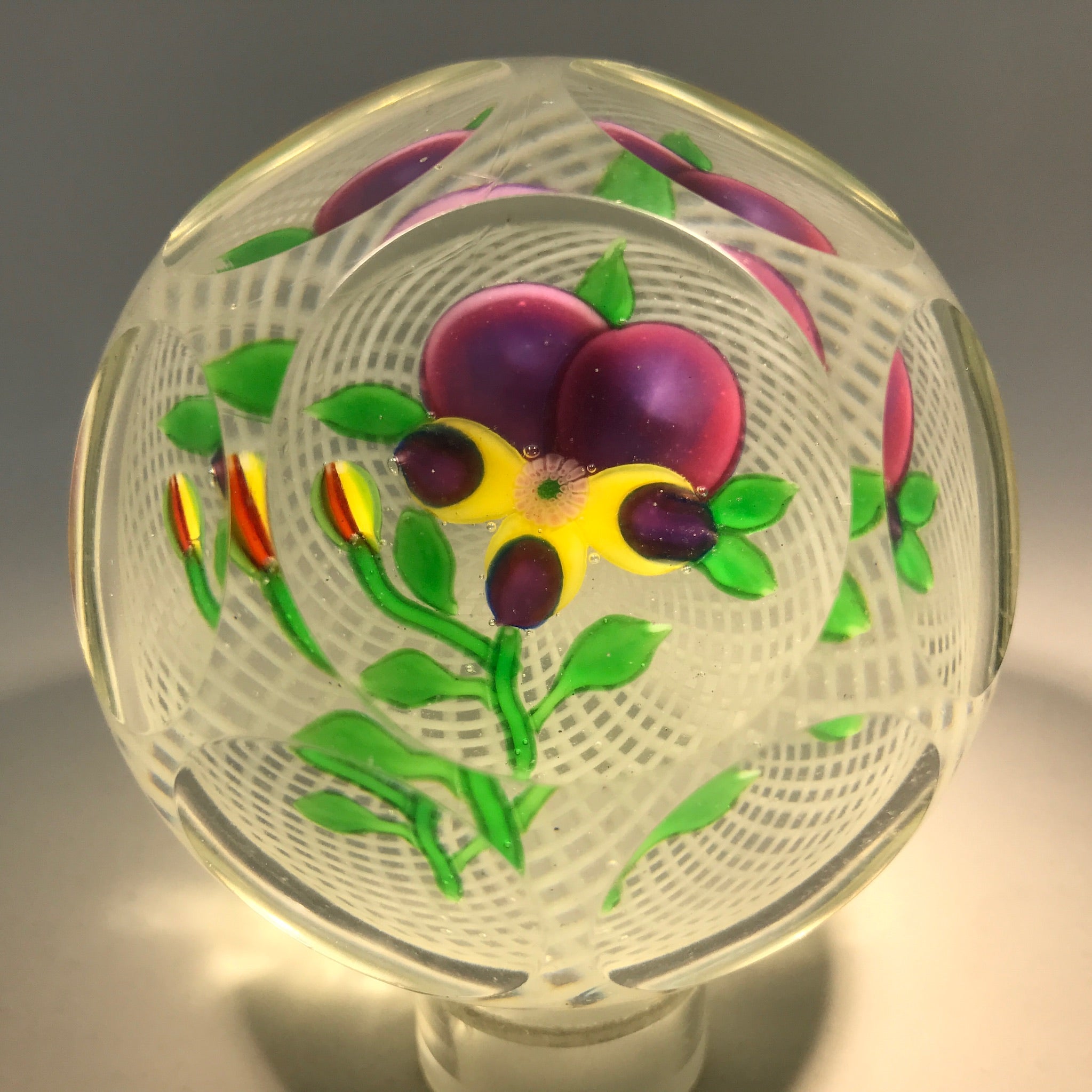A rare and desirable Chinese pansy. Nicely executed with shaded purple upper petals, purple tipped yellow lower petals, one bud and nicely positioned leaves and a stem with good movement. Set over a well formed spiral filigree basket and finished with two levels of concave facets and one top facet.