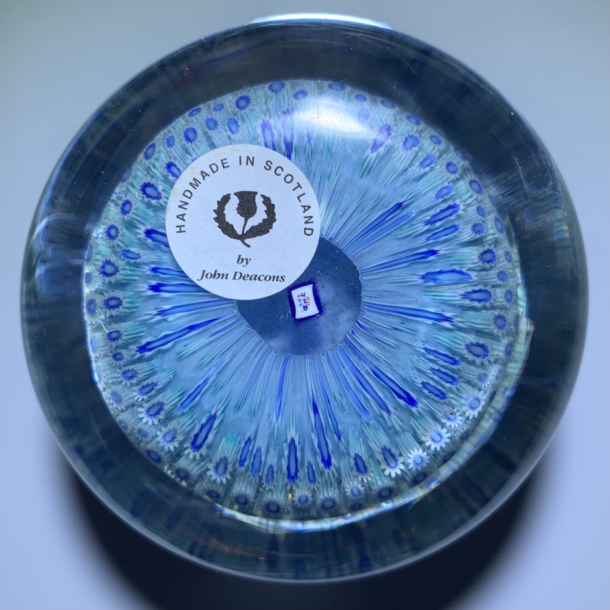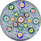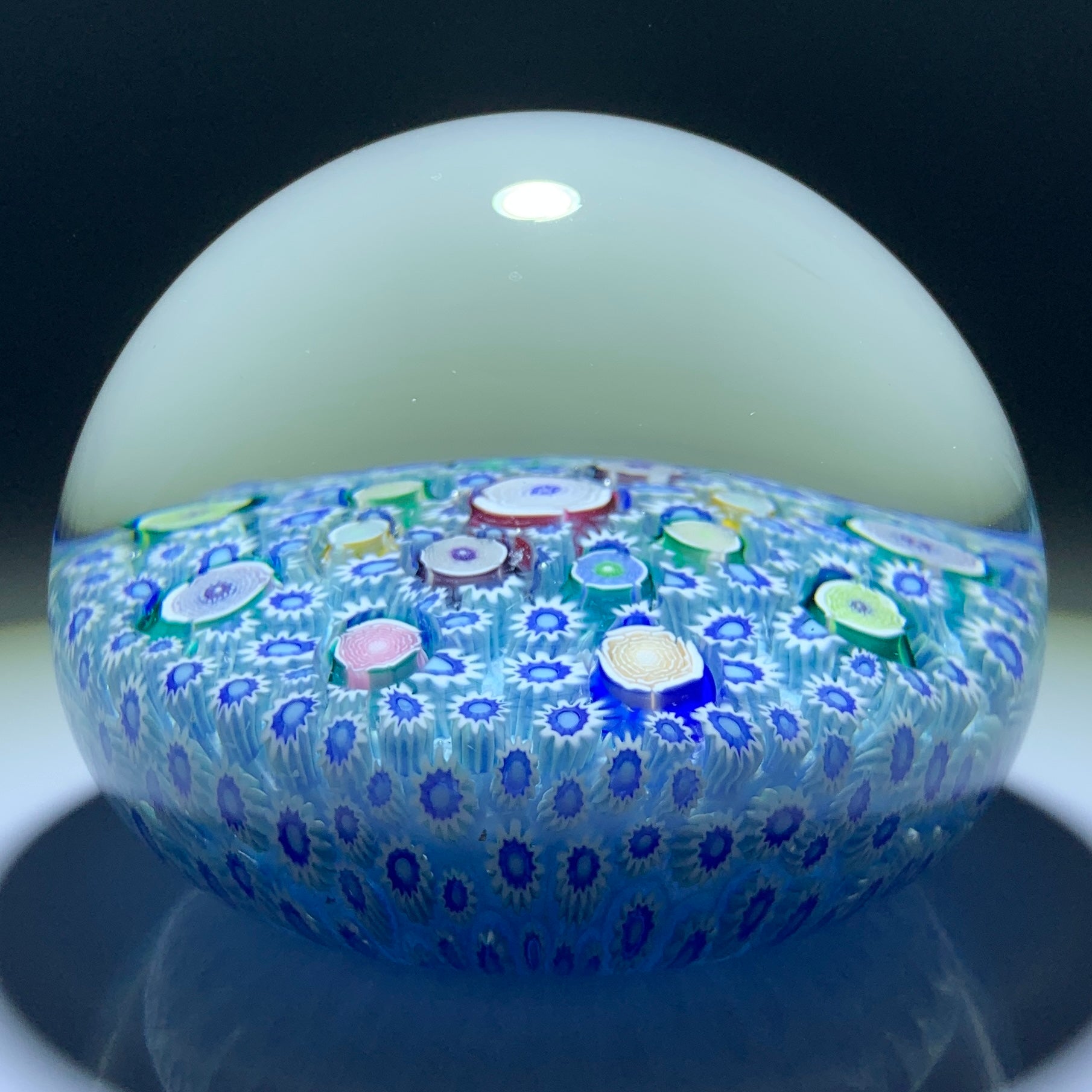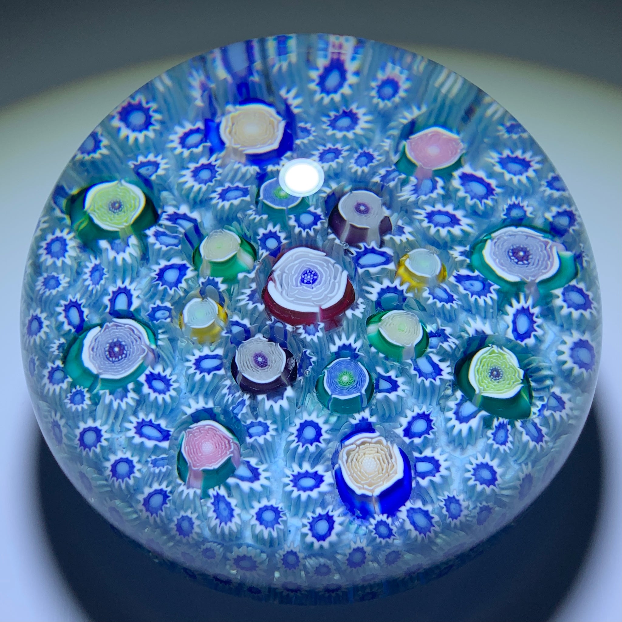 This interesting design appears to be loosely based on a 19th century Clichy moss ground paperweight in which spaced millefiori are embedded in a ground of green moss canes. This modern riff features two concentric rows rose canes embedded on a carpeted ground of blue millefiori.