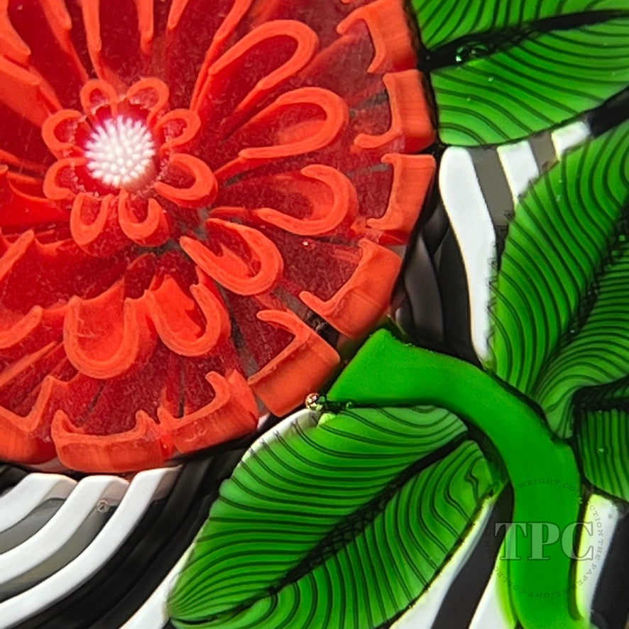A contemporary work from Scottish glass master John Deacons featuring a well centered red pompom blossom with stem and striated leaves over a black & white swirl cushion.