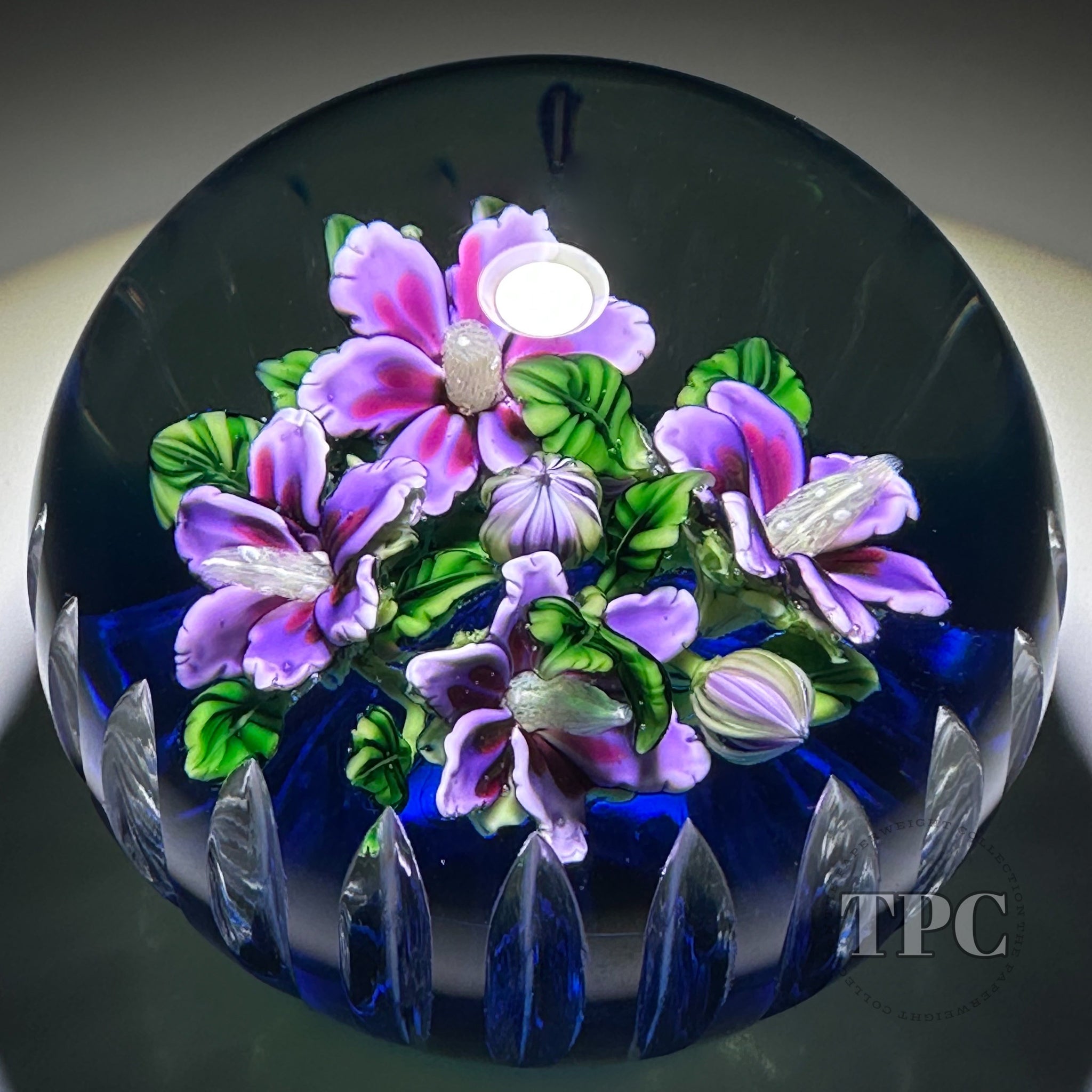 Ken Rosenfeld 2017 Glass Art Paperweight Large Flamework Purple Geraniums on Transparent Blue