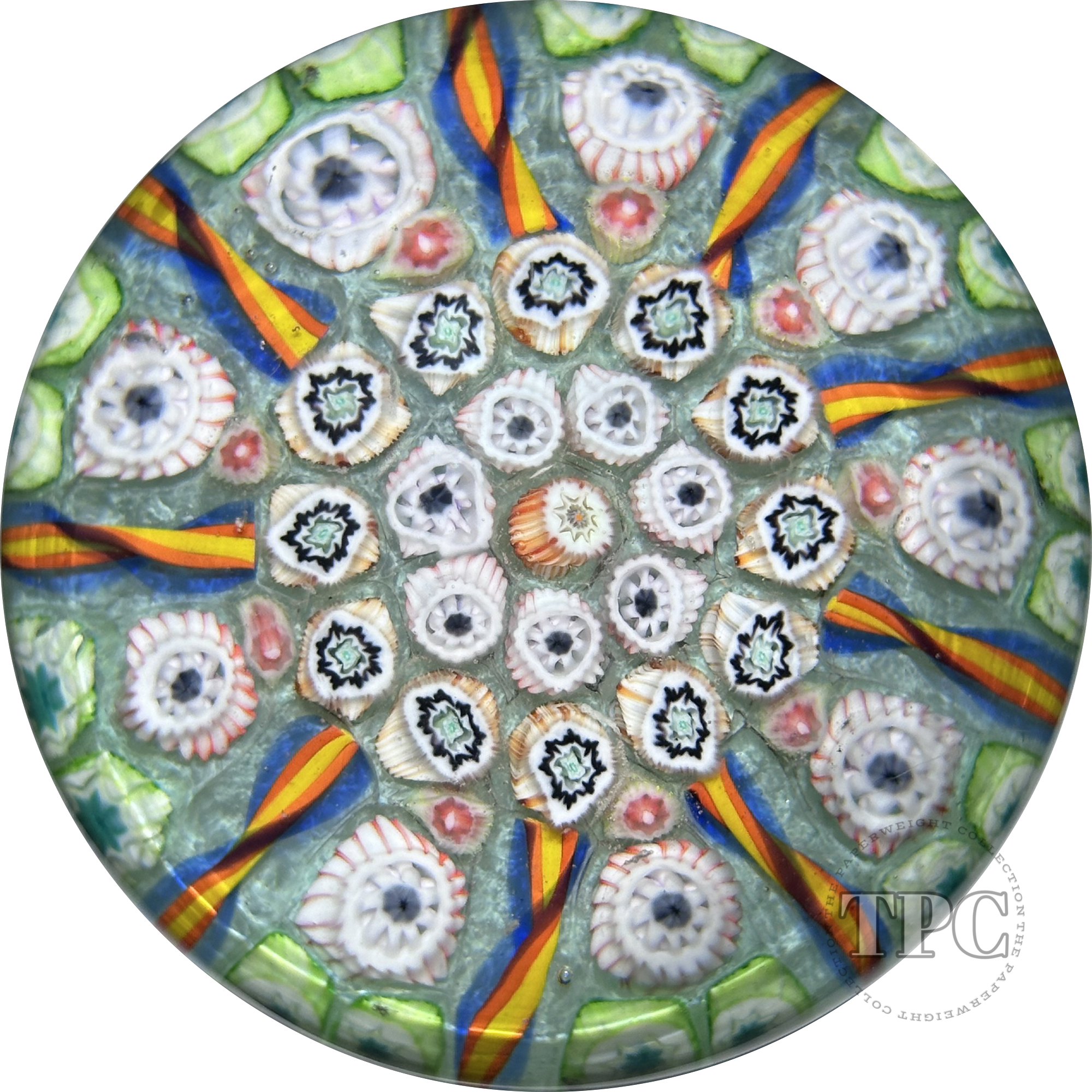 A vibrant and rare dated example, with 8 panels of brightly colored, white, yellow, and orange canes, set in a 1-2-2 pattern, separated by white latticino, on a blue ground.