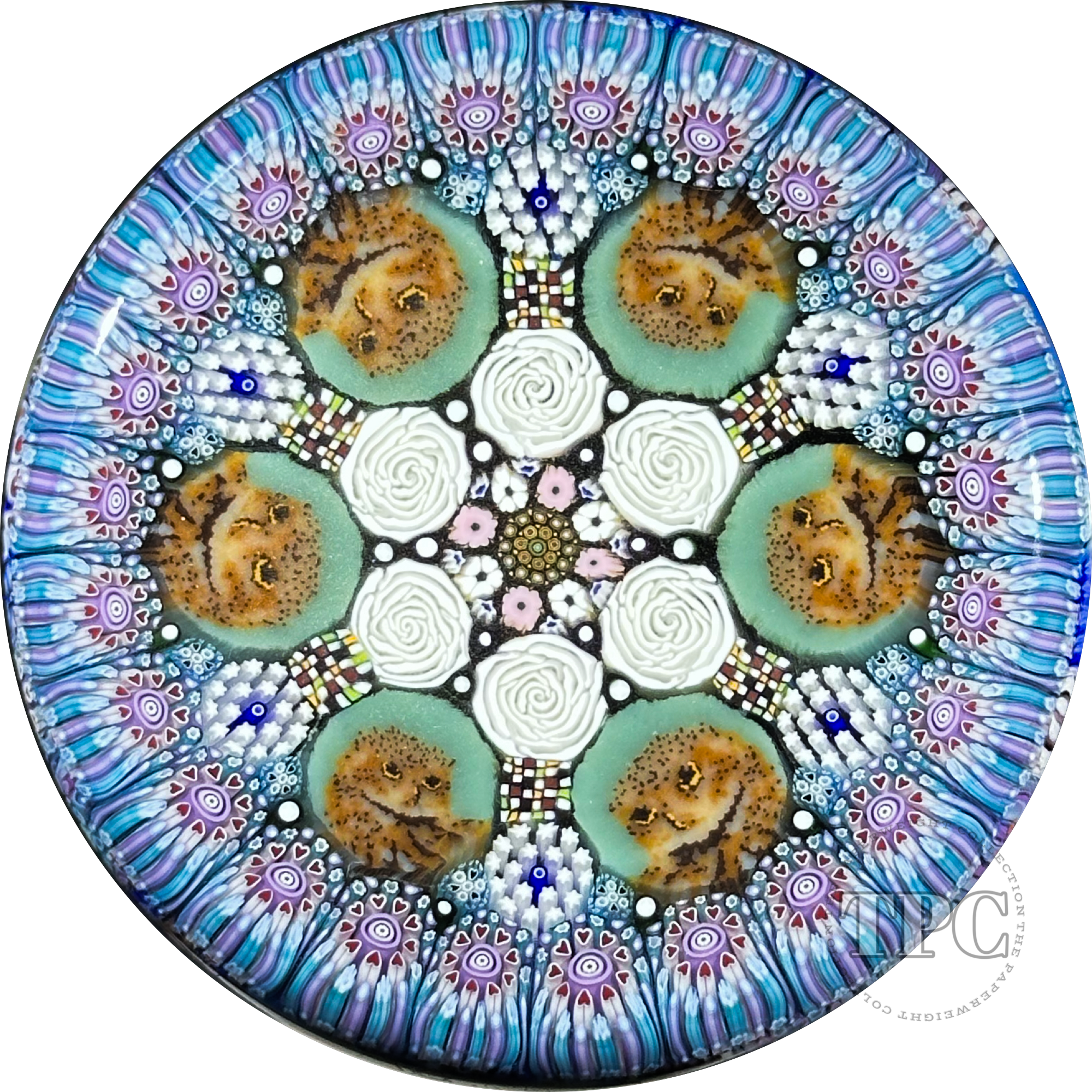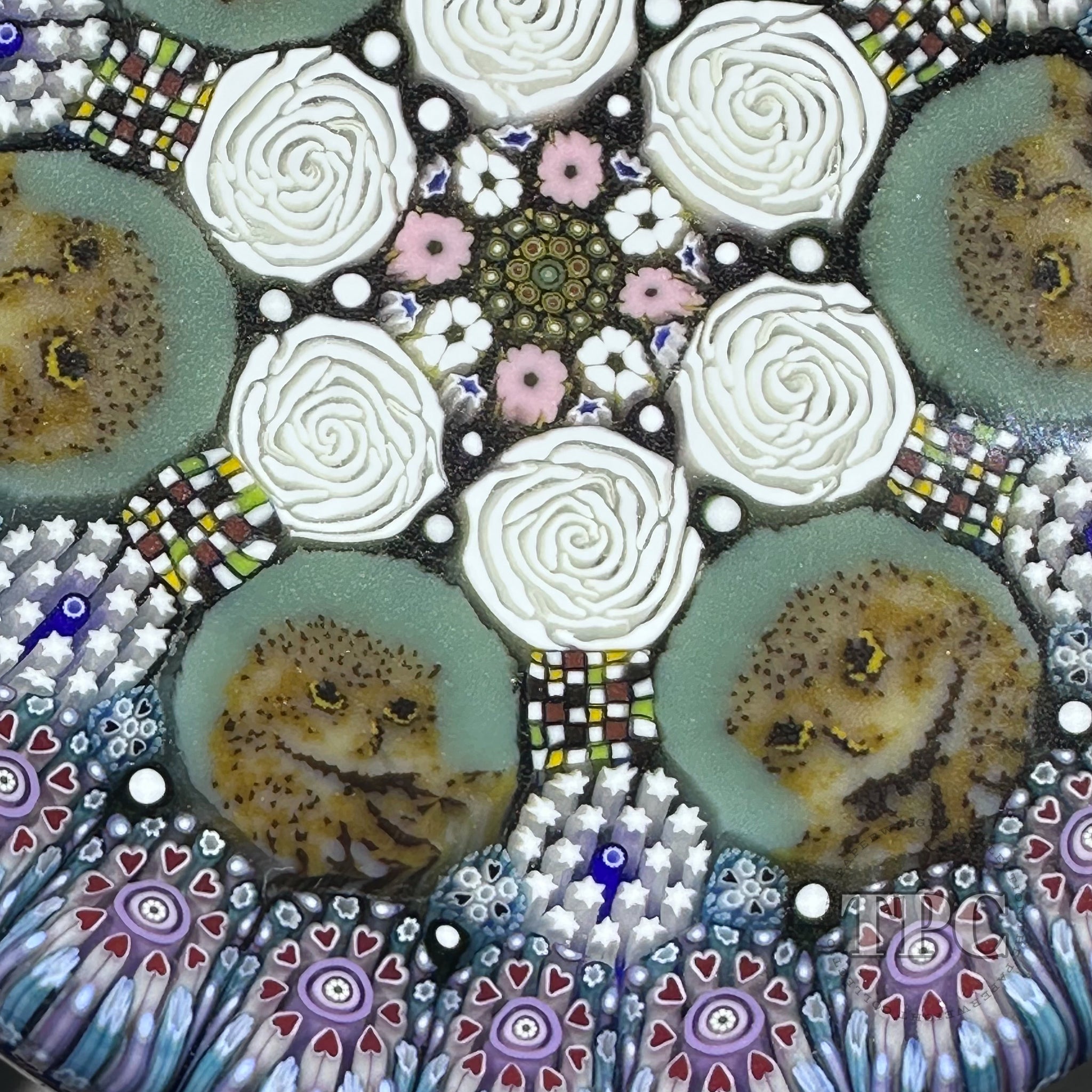 The cylindrical form is clad on the sides with closely packed millefiori, roses, figural and pictorial murrine hroughout. The top is capped with a patterned motif featuring 6 owl murrine, white roses and complimenting complex millefiori.