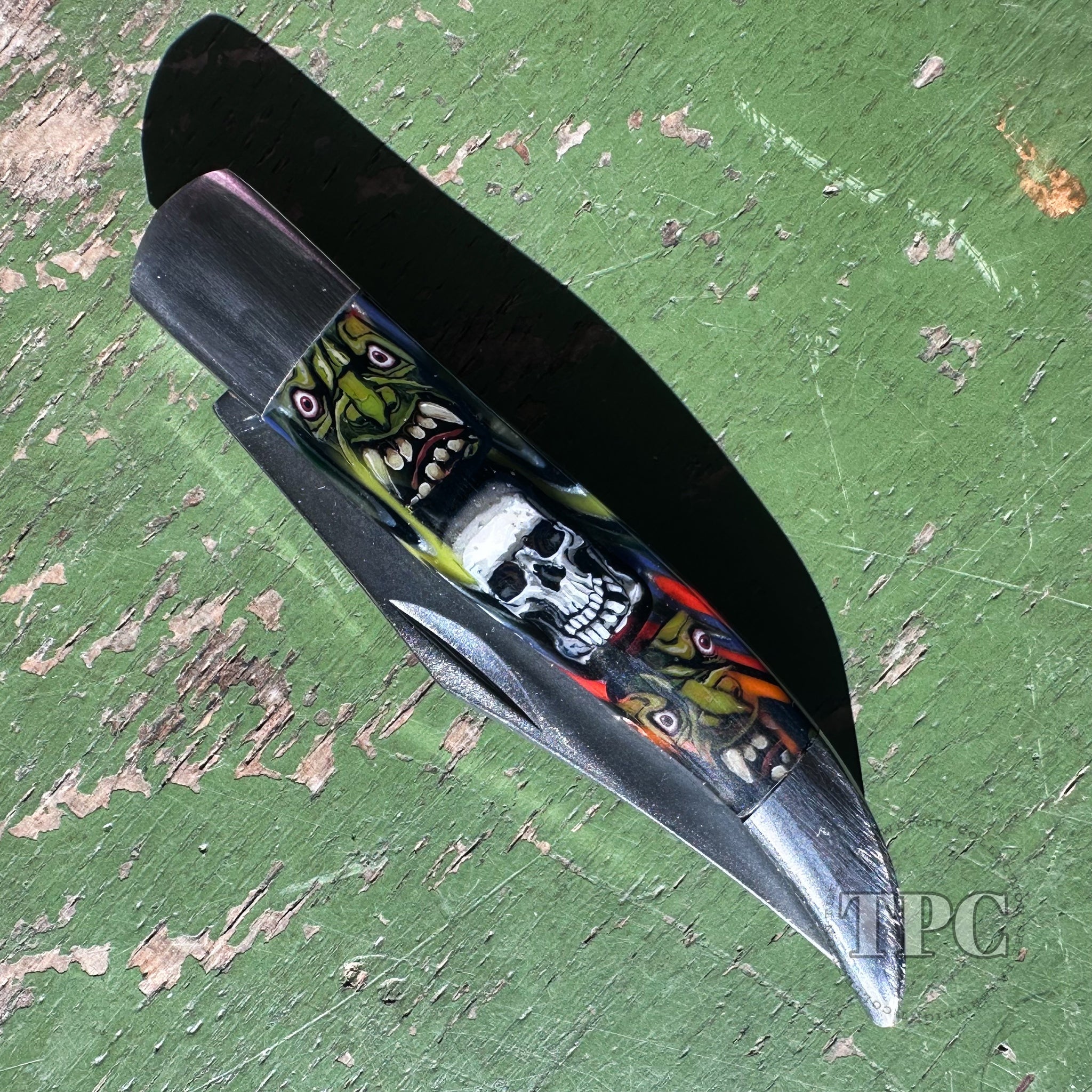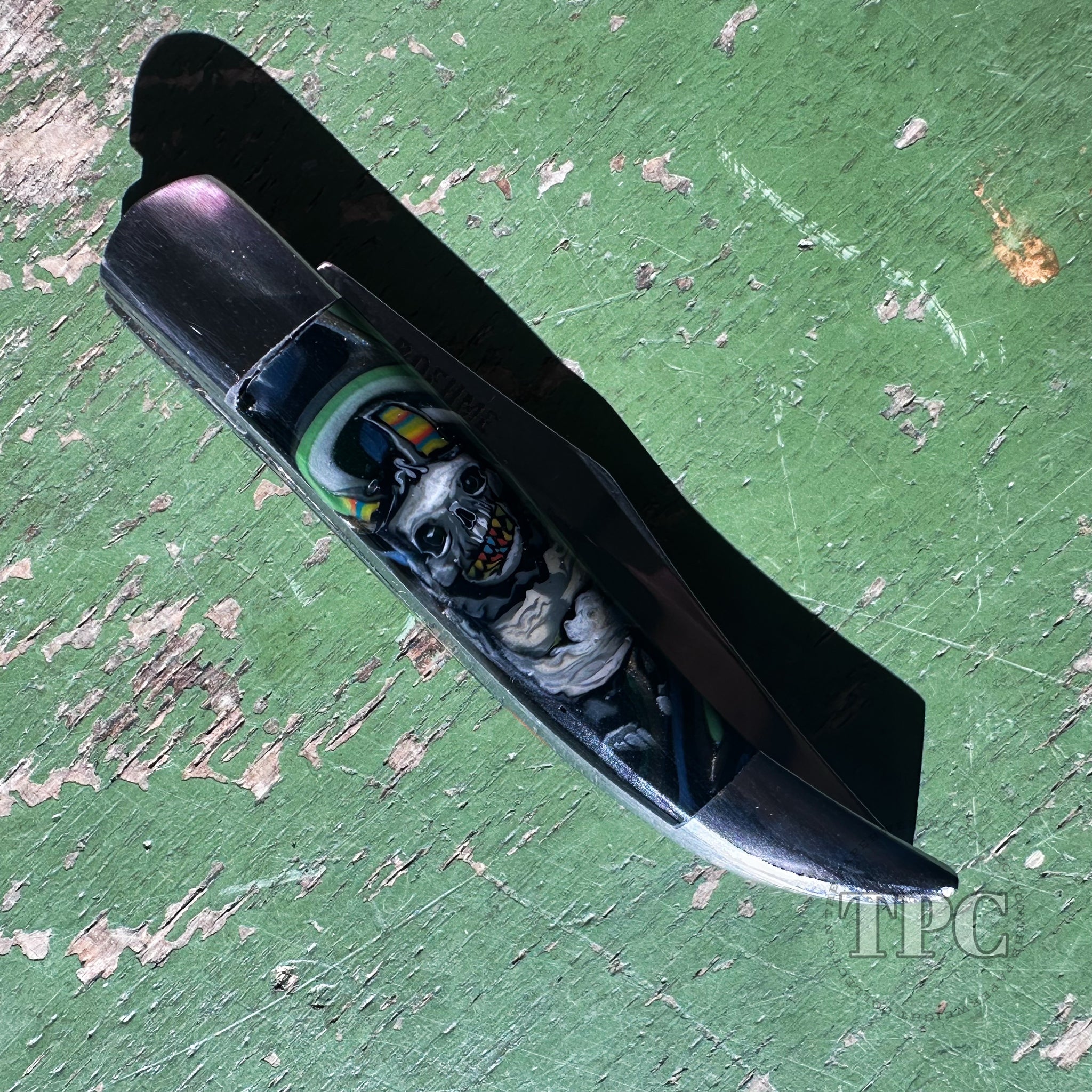 A desirable clip-blade style folder with glass murrine scales featuring a detailed skull masks and more set over colorful wig-wag, cut ground and polished to fit seamlessly into the handle.