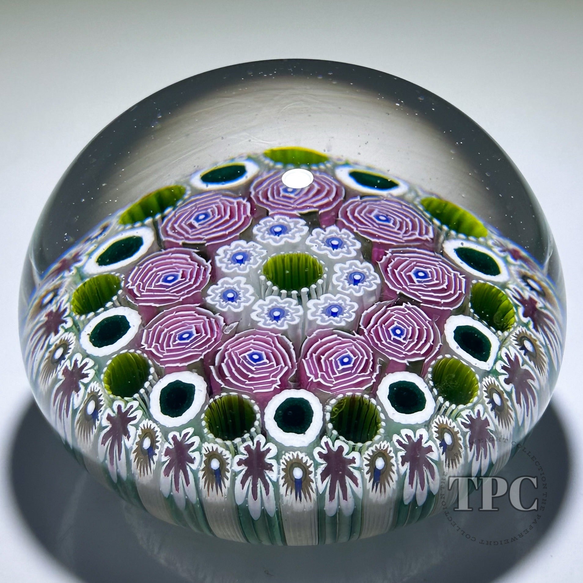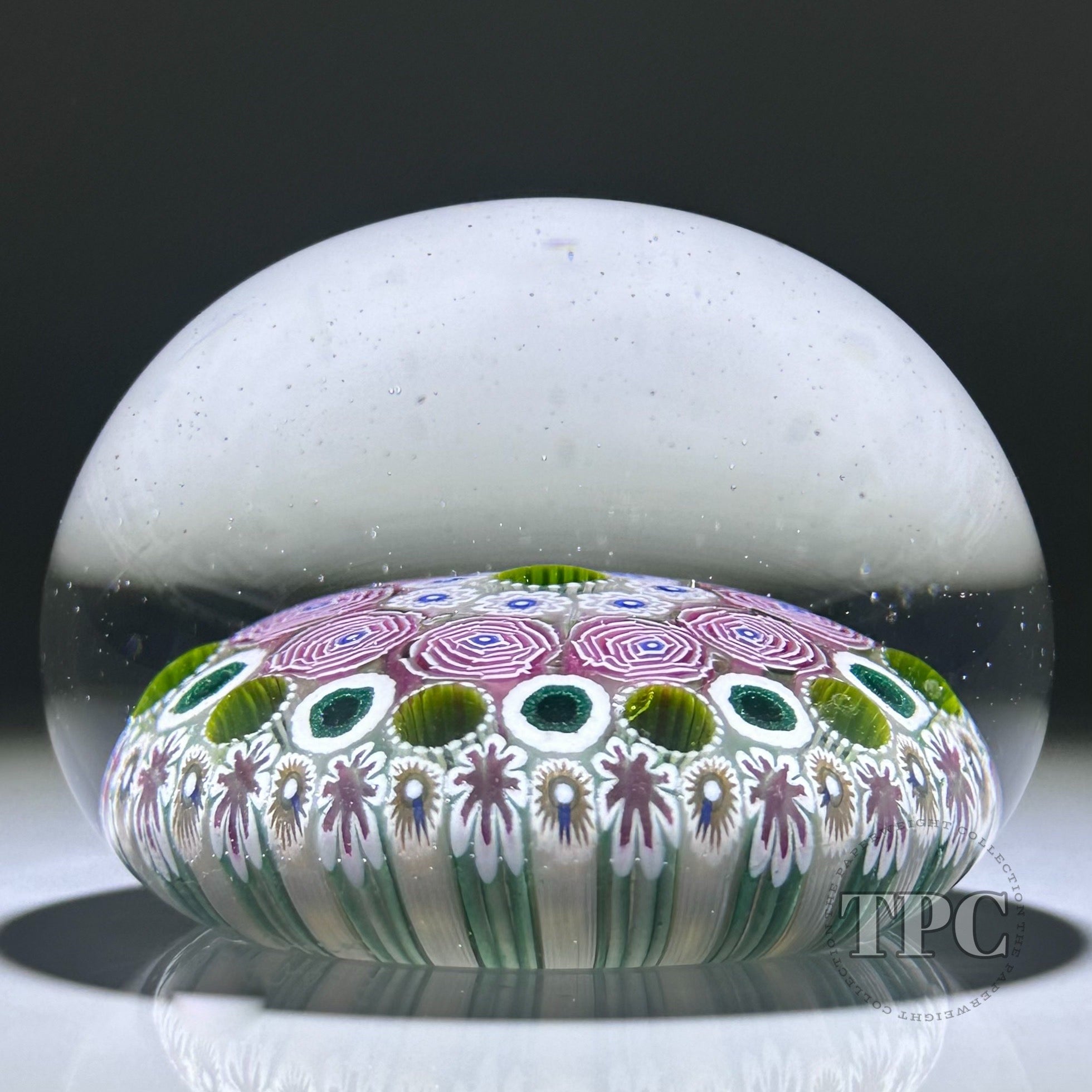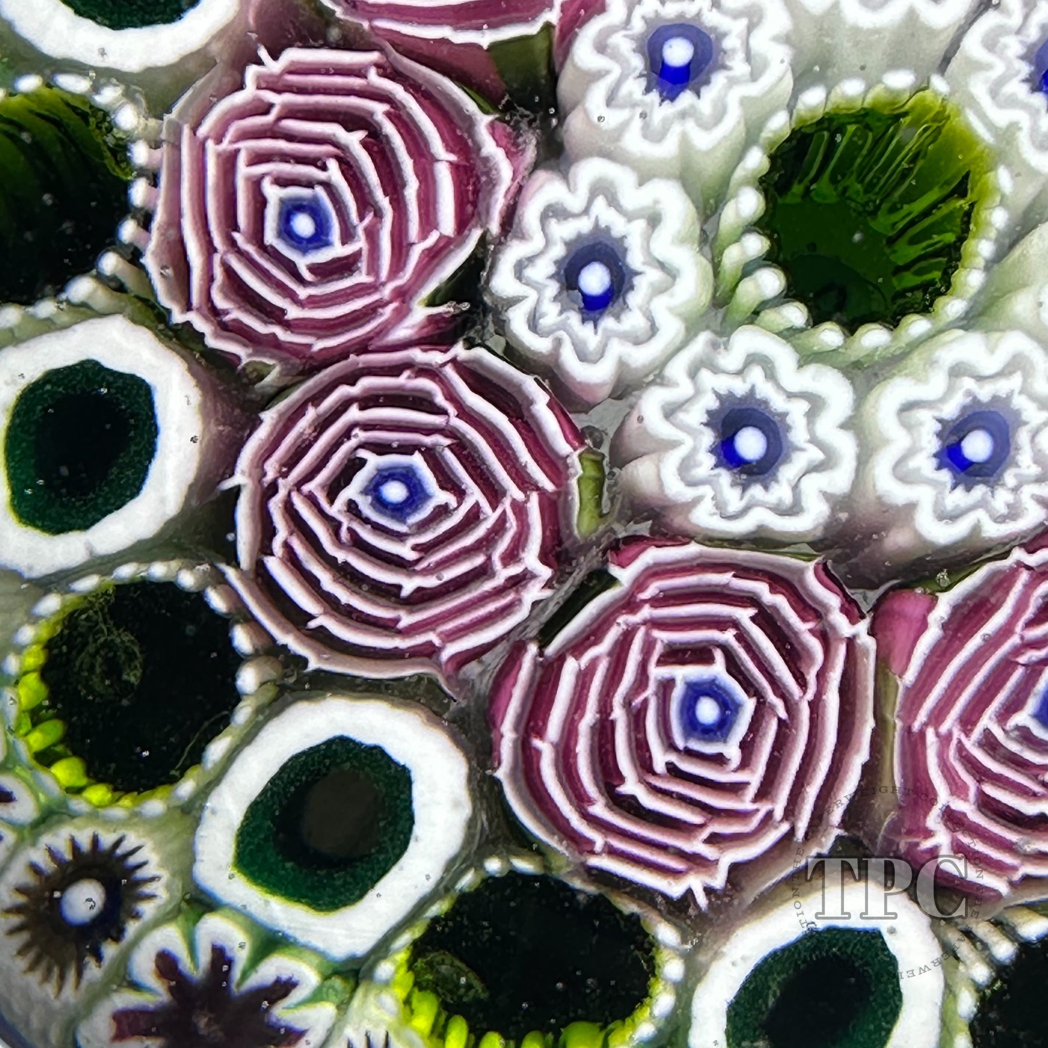 A handsome concentric featuring crimped tubes, floral style murrine, and large Clichy-style roses. The outer row of canes are pulled neatly to the base effectively framing the setup in a tidy basket of staves.