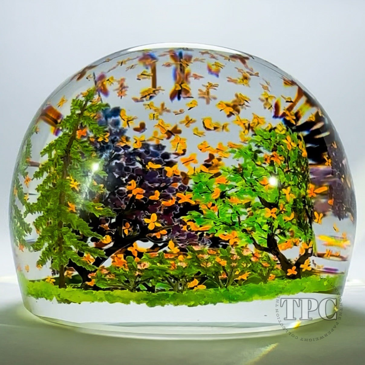 A thousand butterflies burst into motion mid-migration, captured in a breathtaking tableau of alternating layers of hand-painted enamel, suspended forever within clear crystal. For more on Alison and her technique please watch Pondering Paperweights Episode 1.
