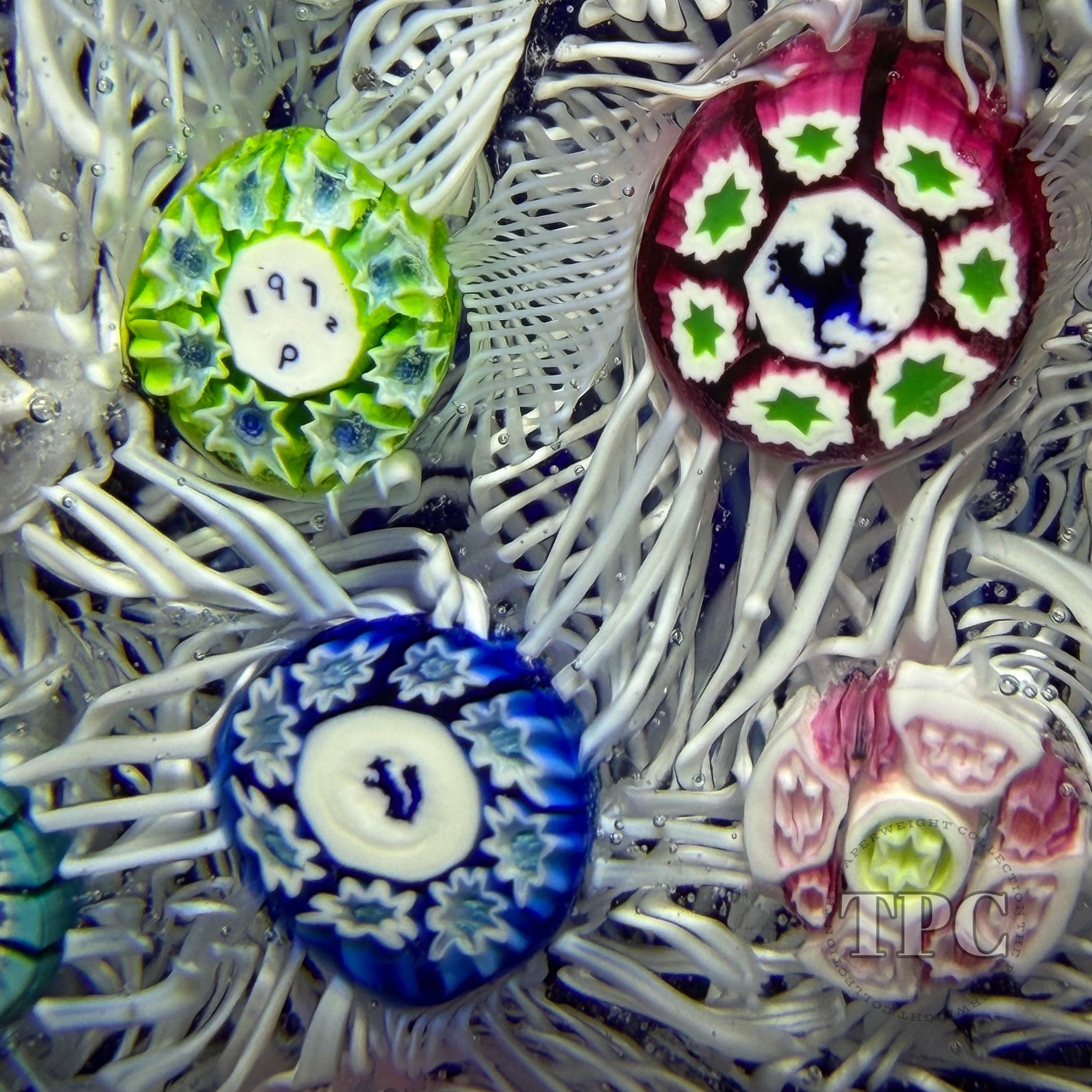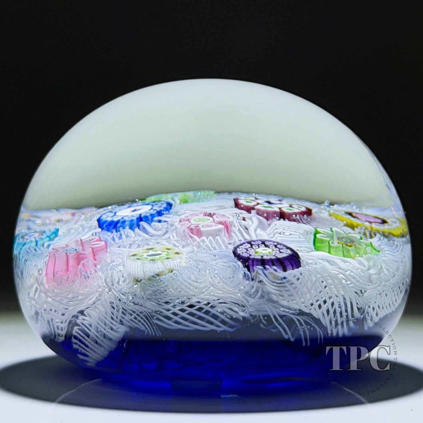 Perthshire 1972 Glass Art Paperweight Spaced Complex Millefiori on Upset White Muslin Lace Over Blue Cushion PP12