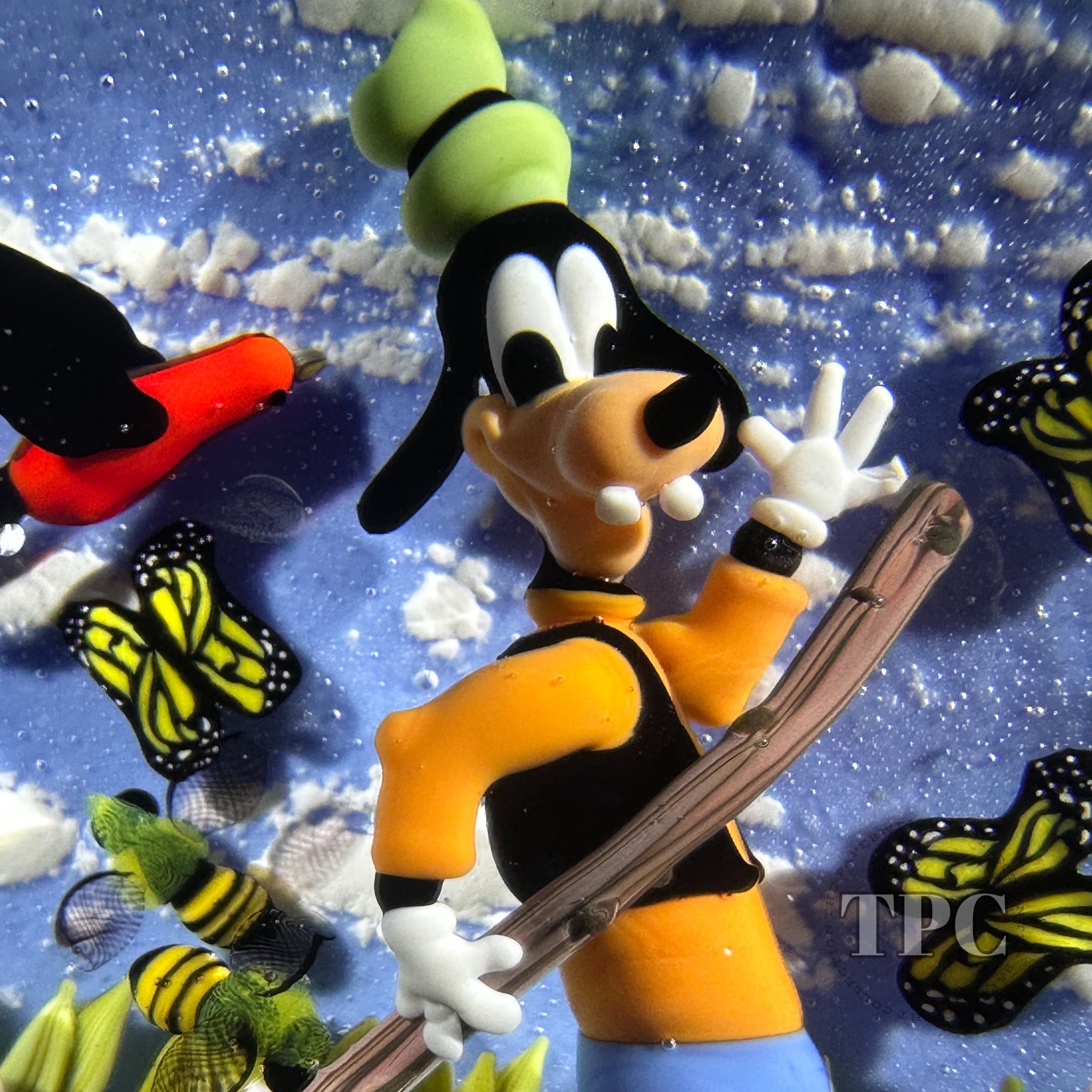 A delightful scene featuring goofy taking a stroll in a field of pink and blue flowers with bees, butterflies, a red bird and a bunny with the fields of green exanding into the distance and downy clouds against a blue sky.