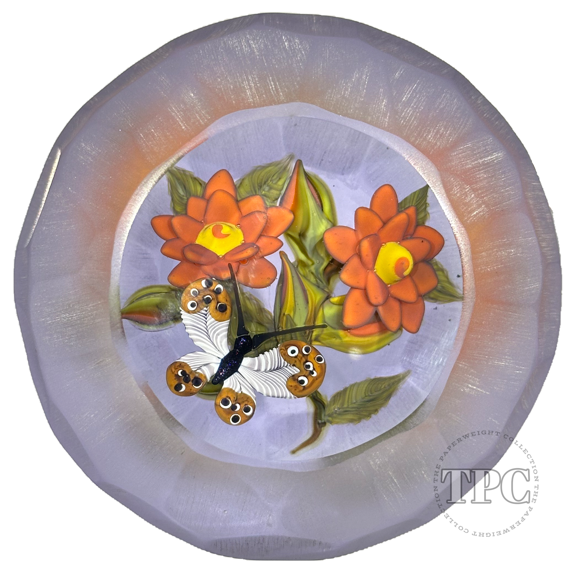 John Deacons Glass Art Paperweight Flamework Clematis Flower on Pink & White Pinwheel Crown
