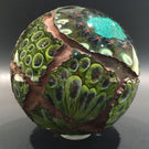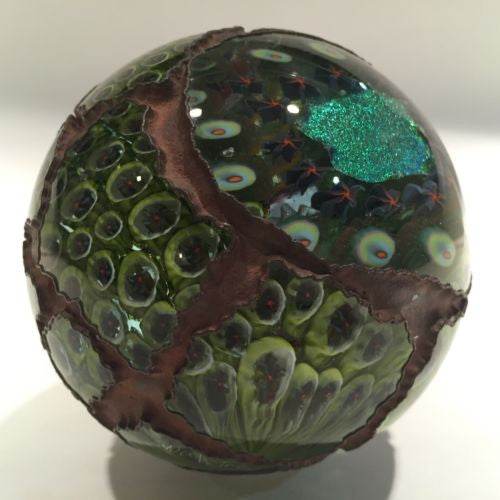 "Due Vetro", a pseudonym for artists T. C. Robertson and Lynn Lakeman, specialized in making these large orbs in the early to mid 90's. This is a particularly beautiful example featuring a twisted cage core covered with a shell of closely packed millefiori canes with dichroic highlights finished with cold worked intricately carved surface and copper electroformed.