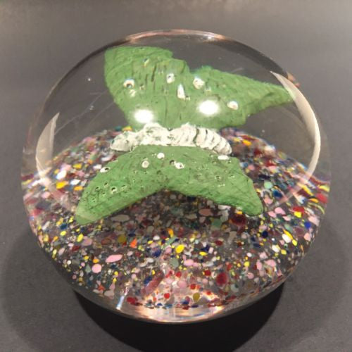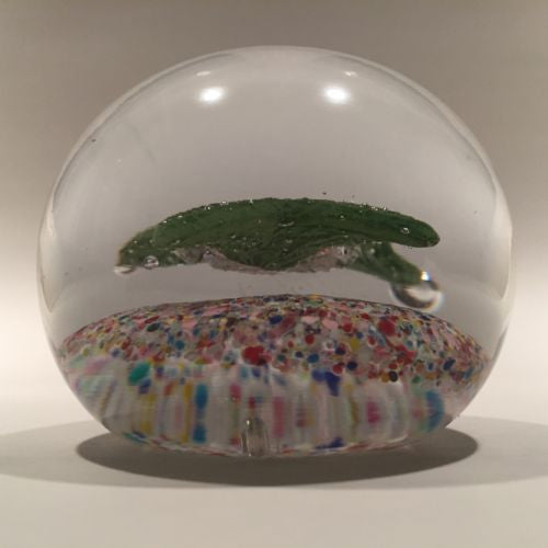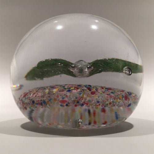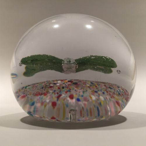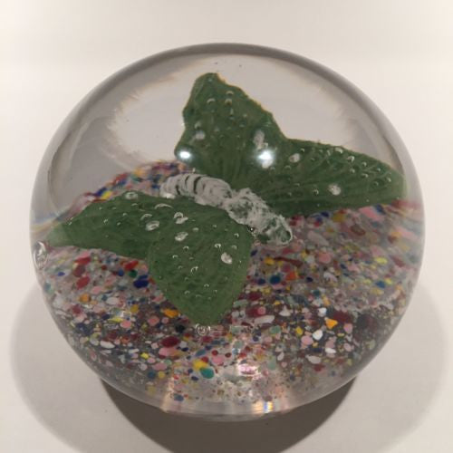 A rare Degenhart design. The butterfly is a pressed figure which has been painted and encased hovering over a multicolored fit ground. Very few of these exist and for any collector of American paperweights this is a must.