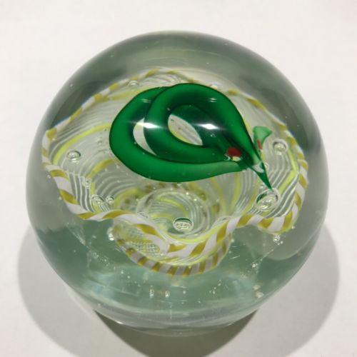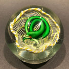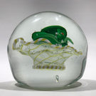 Some of the most interesting mid century Murano paperweights feature this well executed lattice baskets. Most of these will hold millefiori, or lampworked fruit or vegetables, this one however is more interesting featuring a coiled green snake.