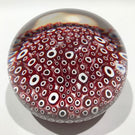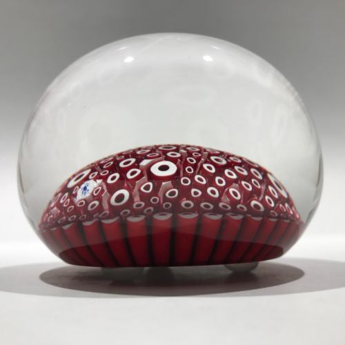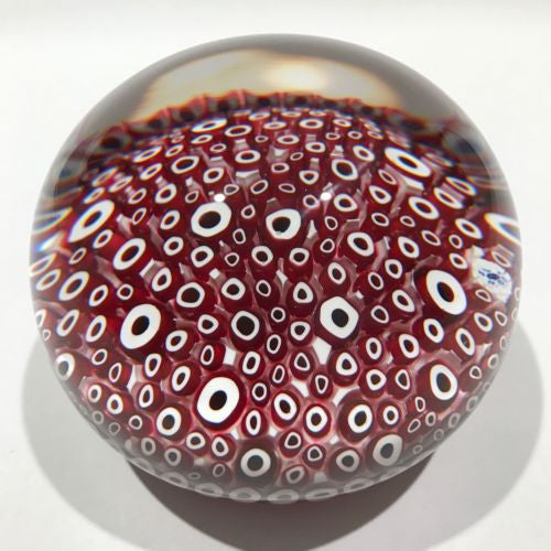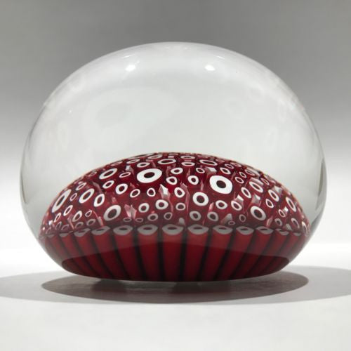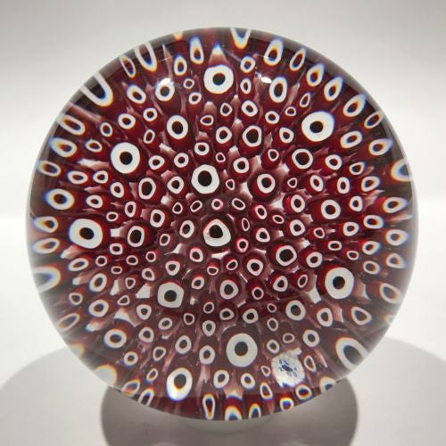 A very unusual modern closepack of maroon and white tube canes embedded on a white ground with the outer ring of canes forming a tidy stave basket.