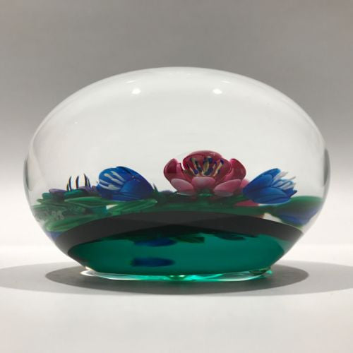 A large bouquet with complex pin, purple, and blue flowers with two buds on a bed of striped leaves, set over a transparent green ground, and finished with a polished concave ground.