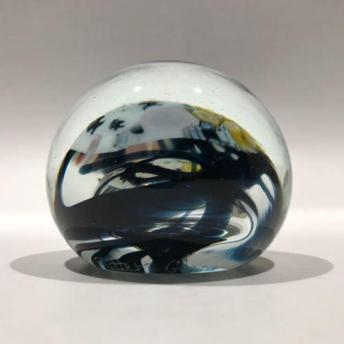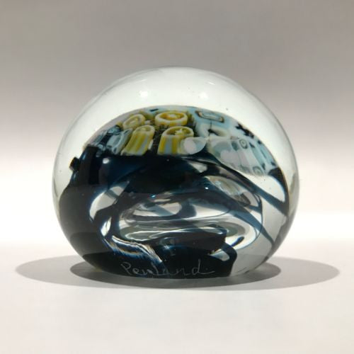 A rare hollow blown miniature paperweight featuring four fish murrini and several other closely packed complex millefiori over a large control bubble with blue threading.