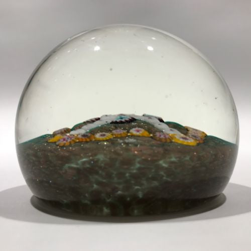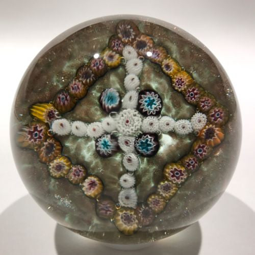 A thoughtfully set garland of ruffled millefiori canes set over a large aventurine cushion.