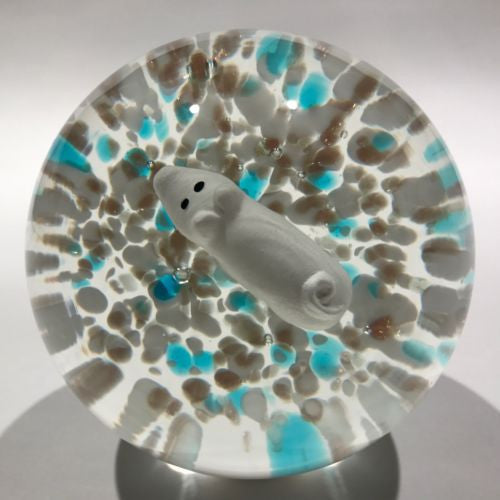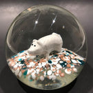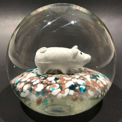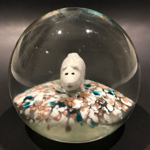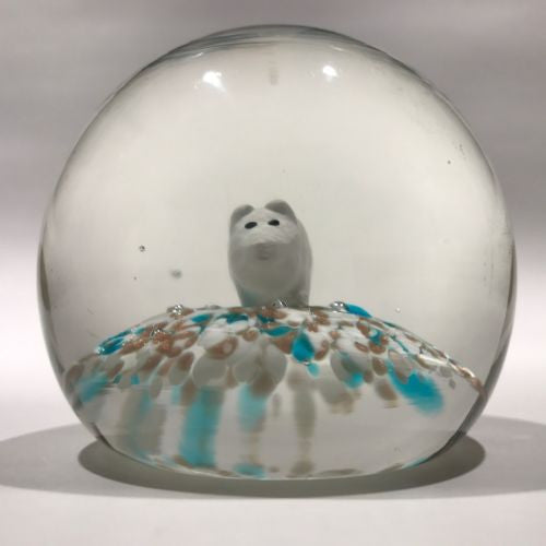 An unusual piece featuring a well centered white pig sulphide with black eyes, at rest on a speckled ground of white, blue, and aventurine. A typical early to midcentury Aemerican motif however the shape of the dome, glass quality, treatment of the base, and the presence of aventurine point to Murano as the origin.