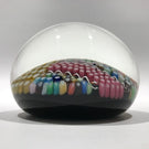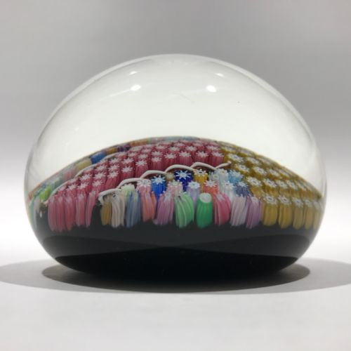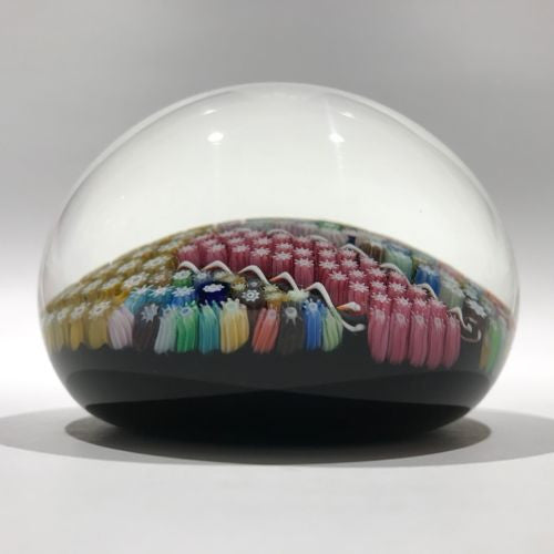 An unusual Perthshire design (PP122 from the General Range) in production from 1990 to 1995 featuring an asymmetrically placed closepack of colorful cog canes and ribbon twists over an translucent black ground representing a rising sun.