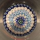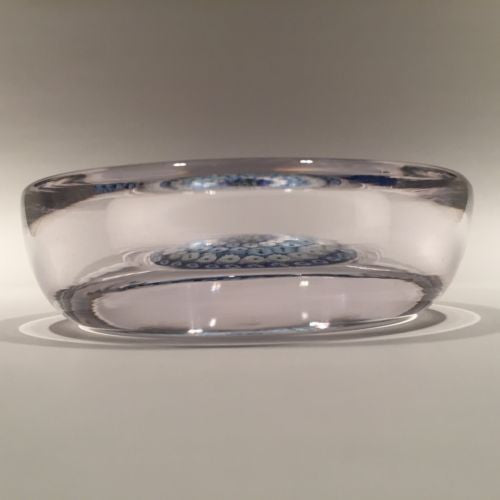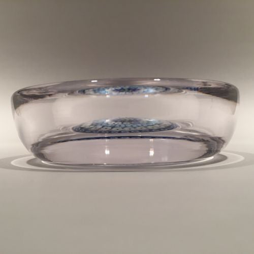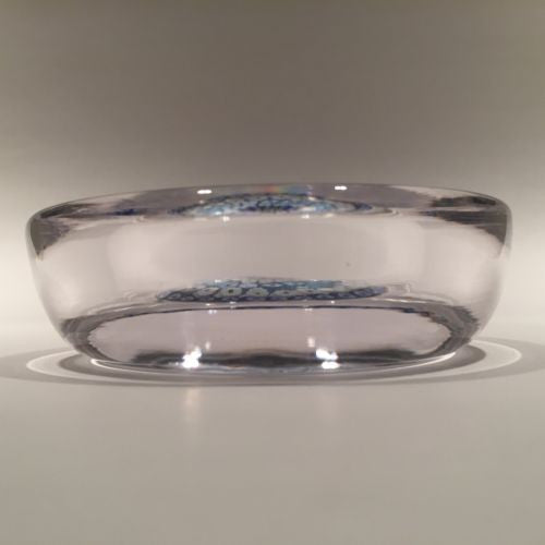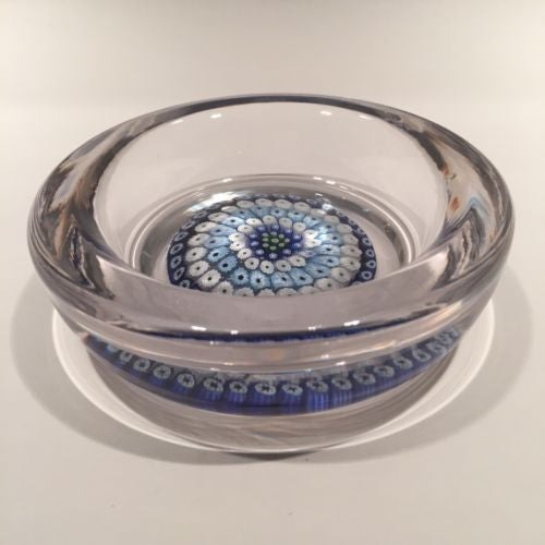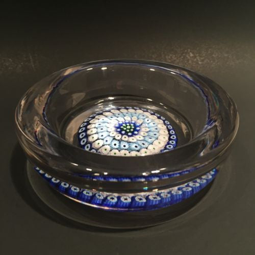 Six concentric rows of blue & white millefiori canes with hints of green set over a clear ground and skillfully formed into a small bowl with stout walls.