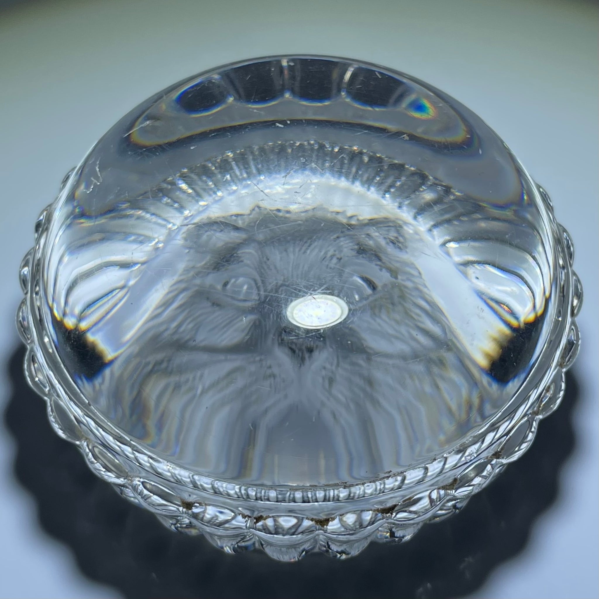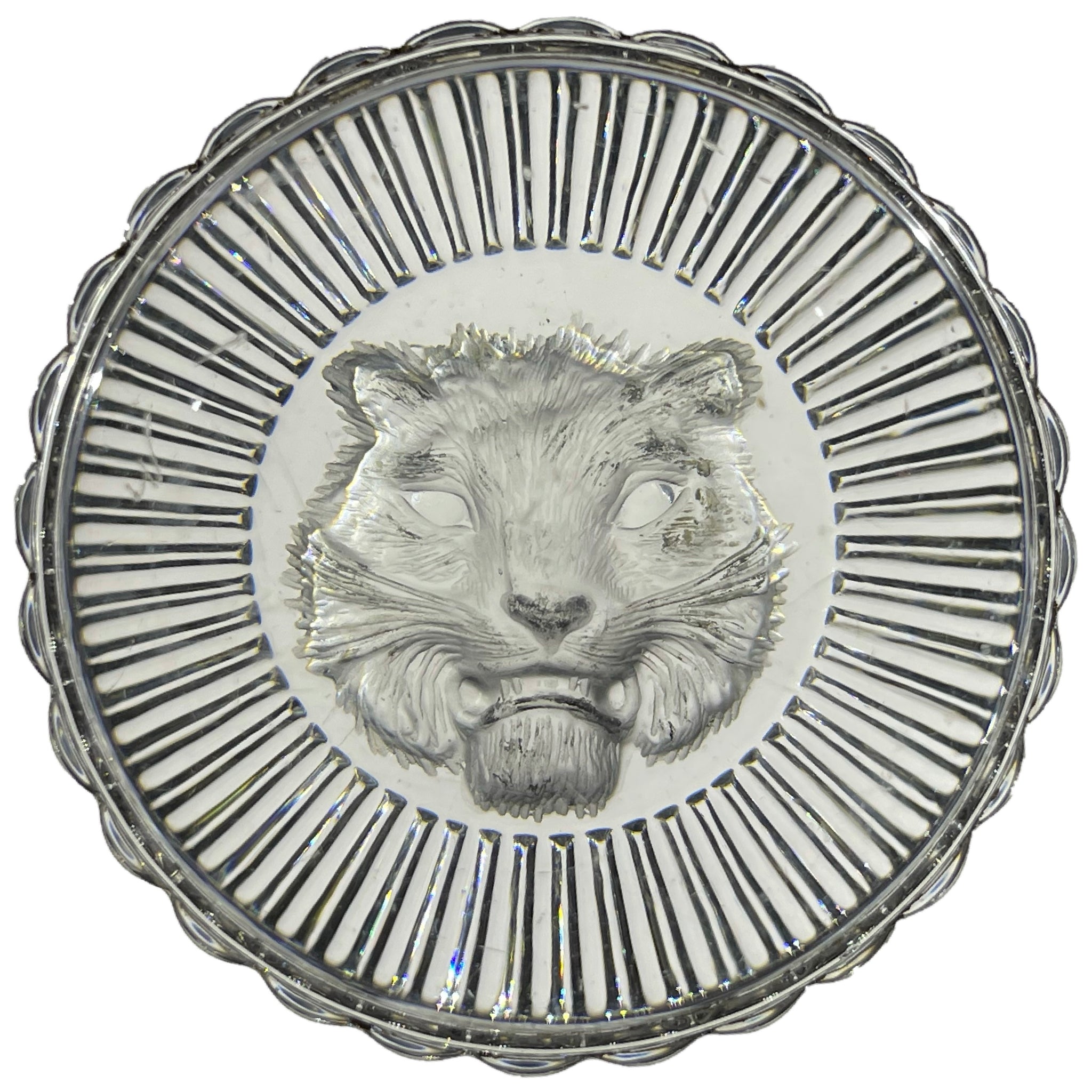 A detailed intaglio design featuring a menacing looking cat with fine hair and whiskers baring its teeth. Set in a round molded shape with fluted outer circumference.