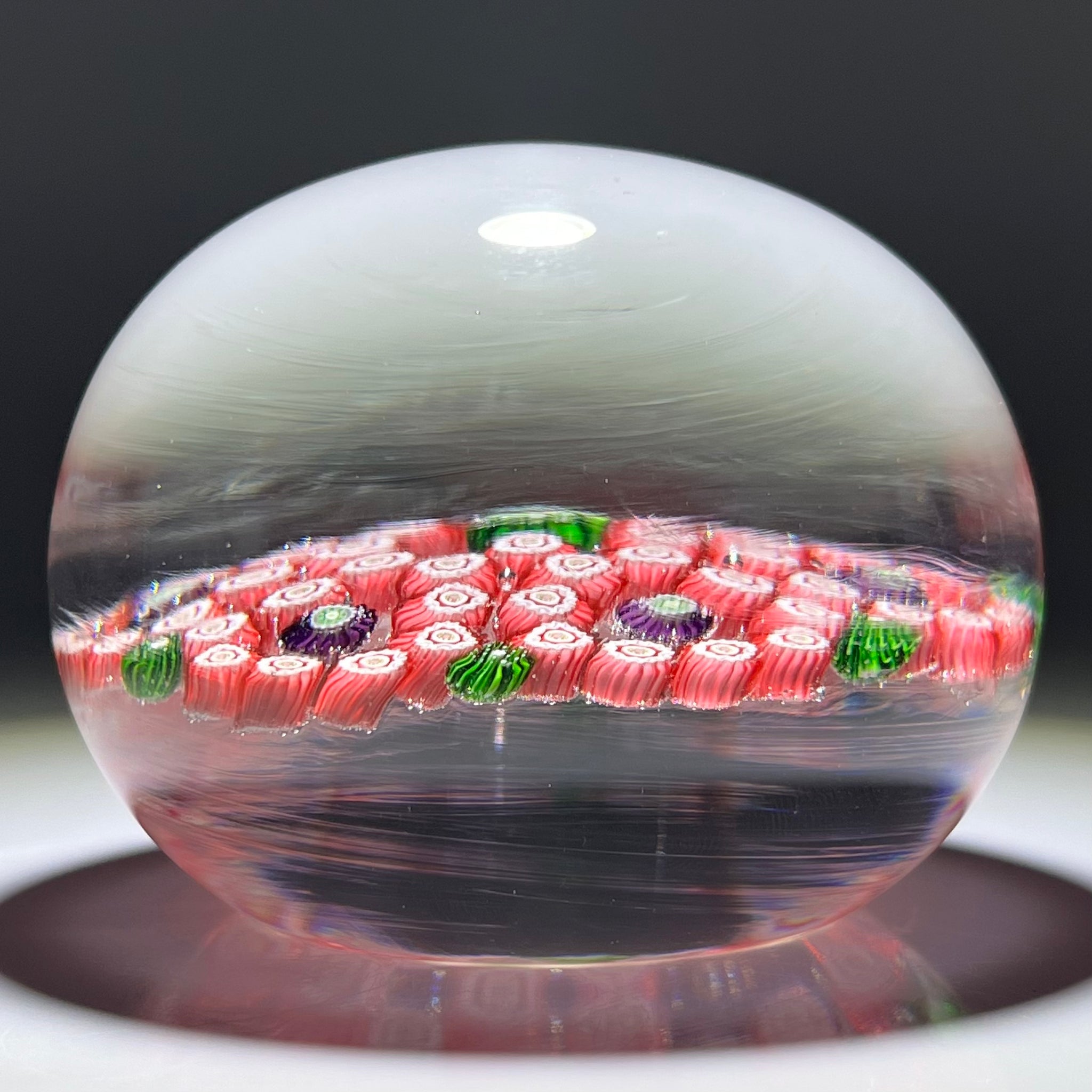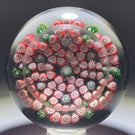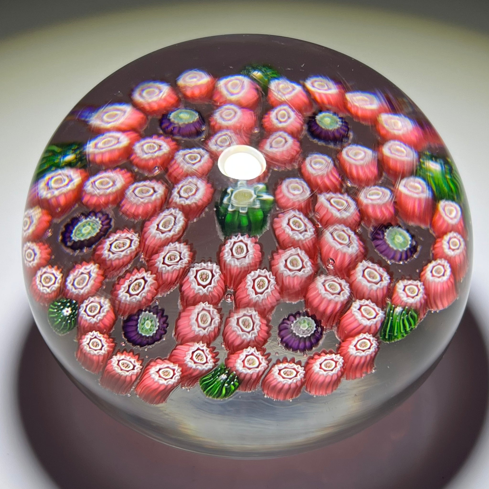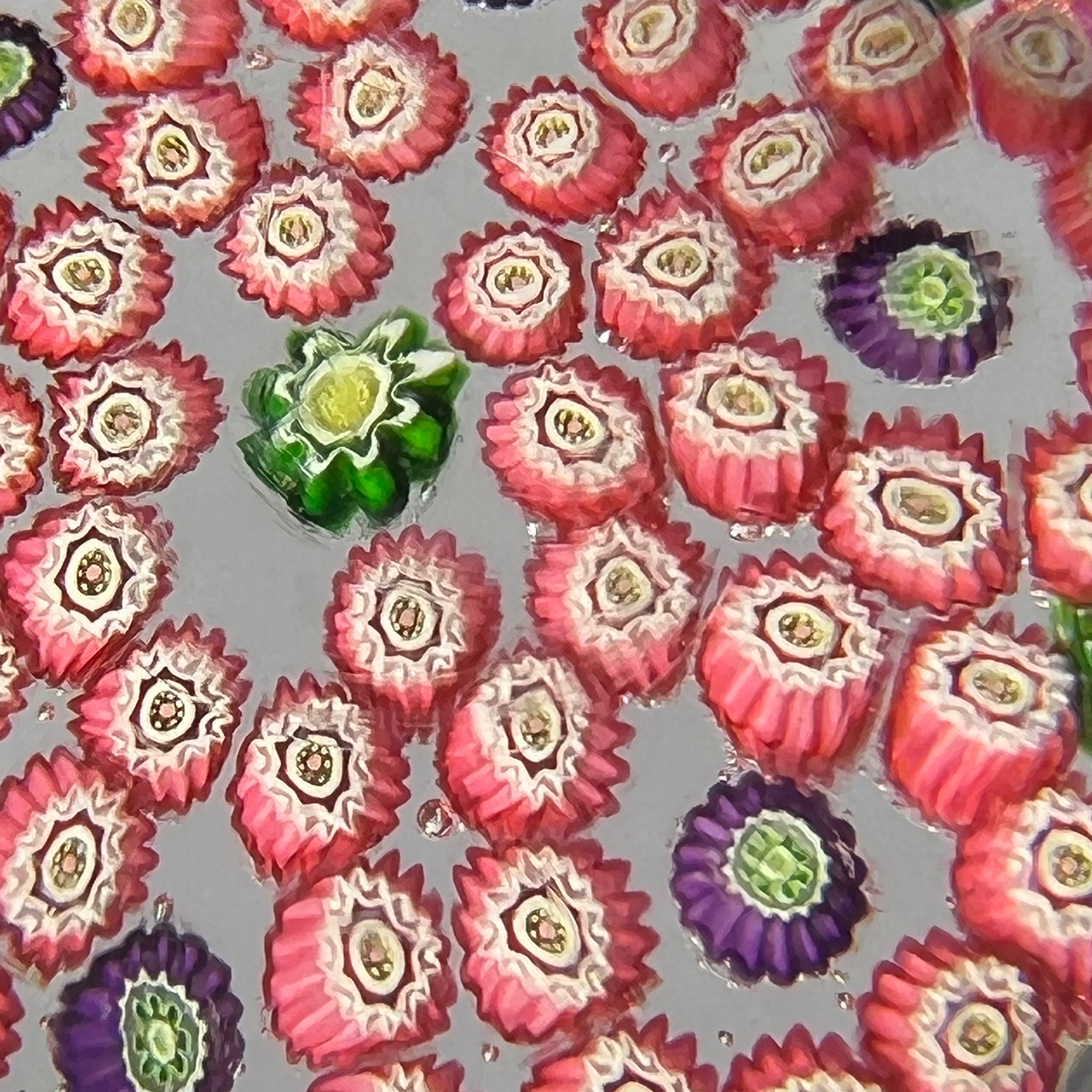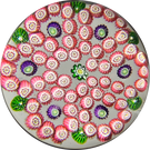 A large example featuring a complex six lobed garland composed of pink millefiori with purple canes within each loop and center and green moss canes between each lobe on the periphery. Set on a clear crystal ground.
