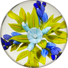 A flamework bouquet featuring a central morning glory blossom with swollen buds various shades of blue set over a clear ground.