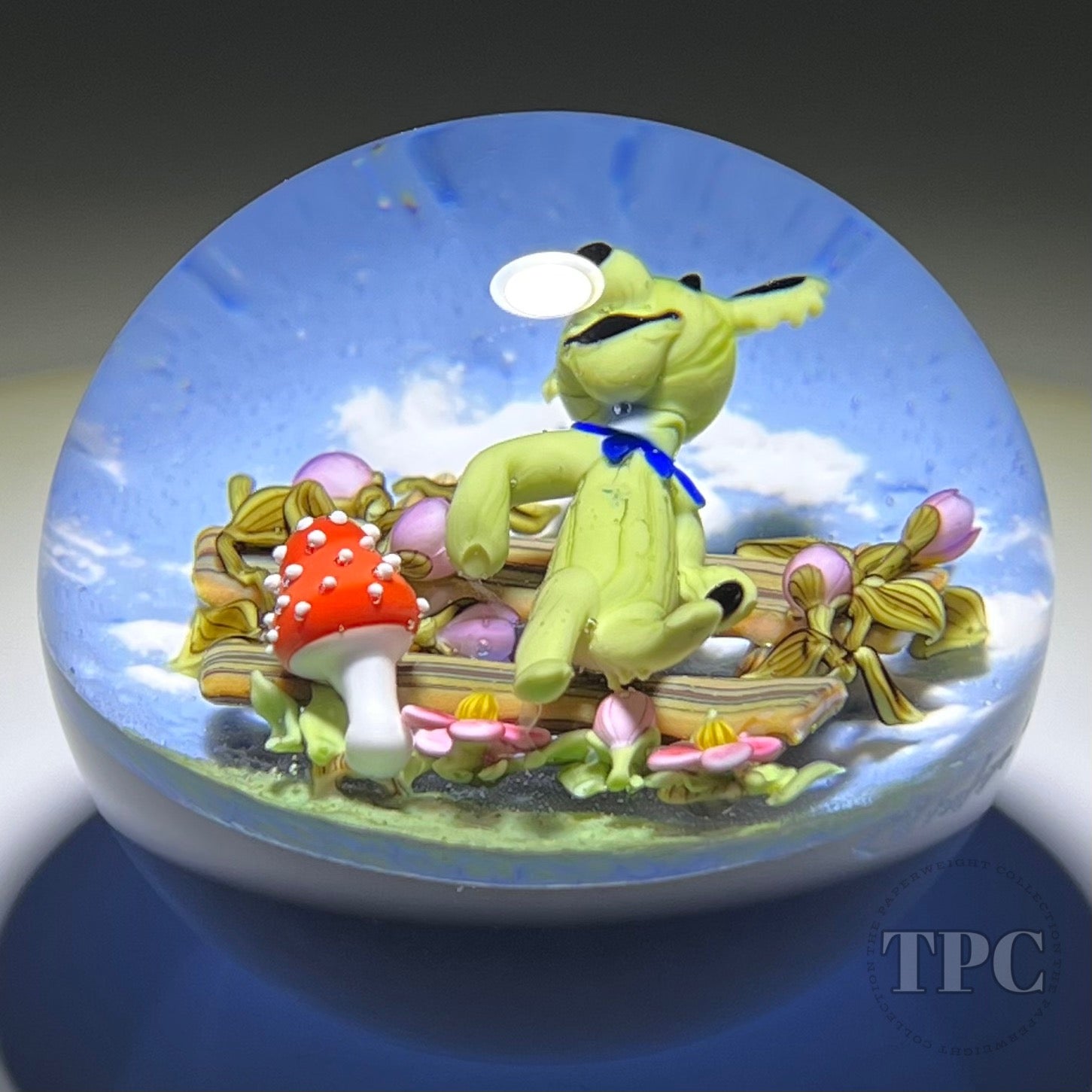 A TPC exclusive, the iconic Grateful Dead dancing bears in glass. A full set of five small weights were made featuring one of each color bear (blue, green, yellow, orange & pink). Each bear is set against a cheerful blue sky with clouds in front of a wooden post rail fence that's draped with mauve colored climbing roses. In the foreground the bear struts through a field of pink flowers and white speckled red amanita mushrooms. Catch 'em before they march away!