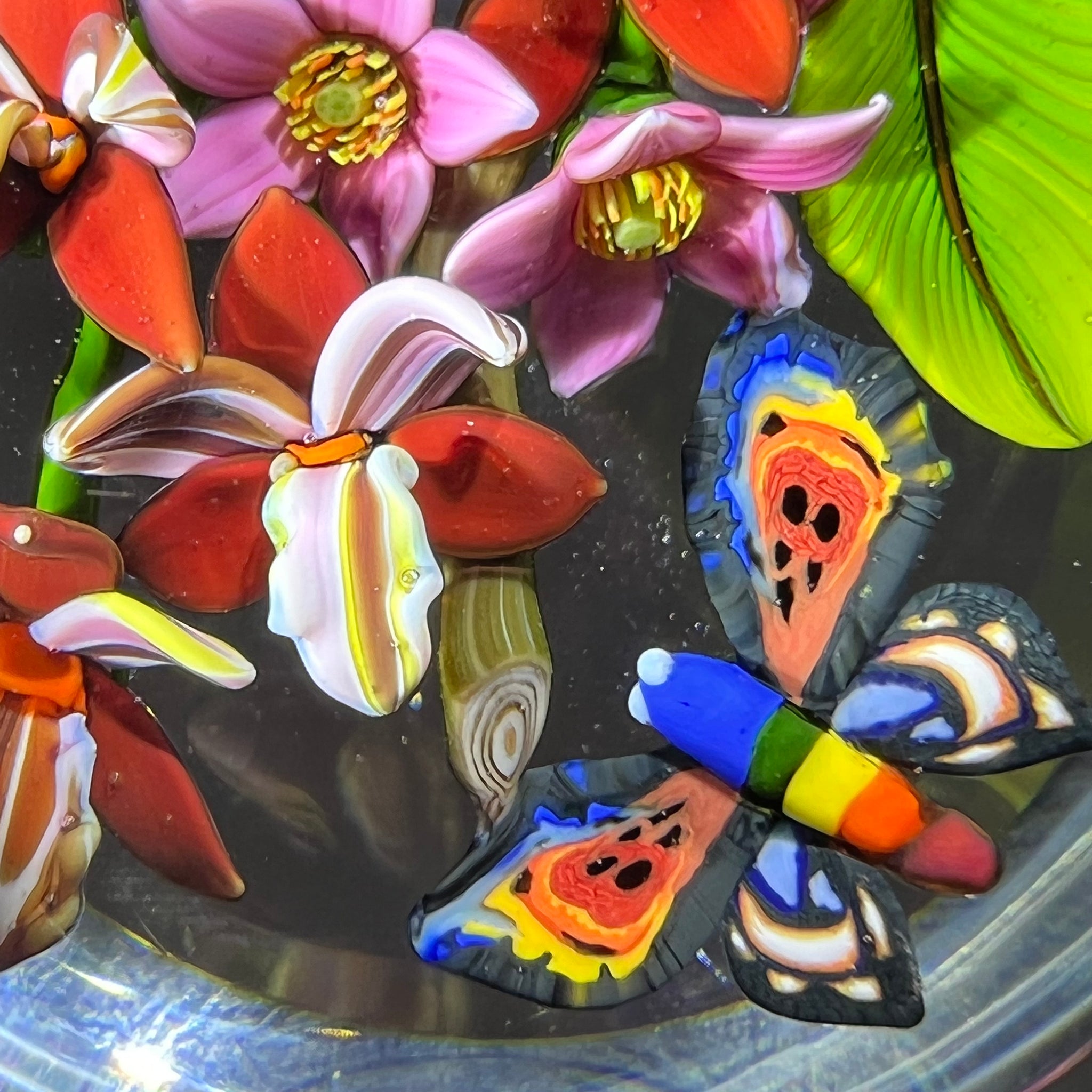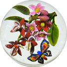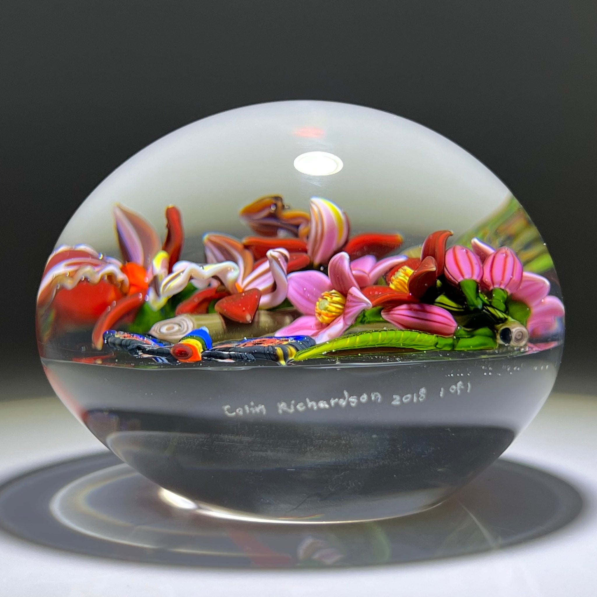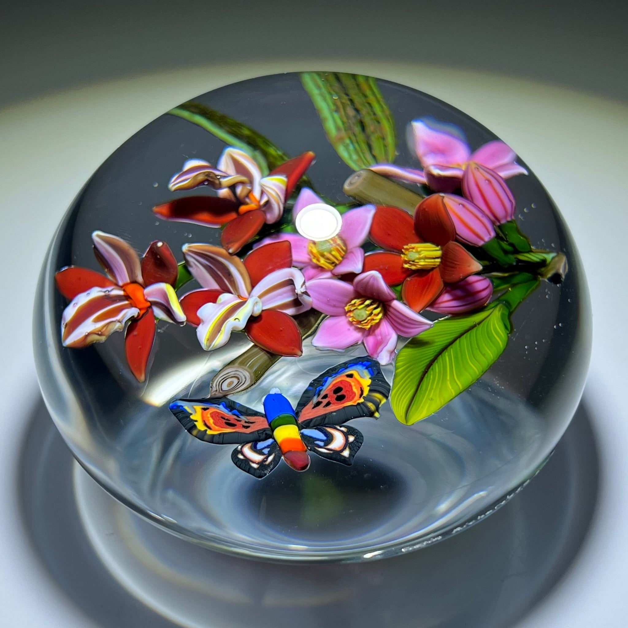 Colin Richardson 2018 Glass Art Paperweight Flamework Rainbow Butterfly with Orchids and Tropical Flowers 1 of 1