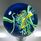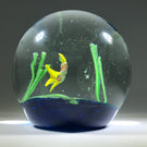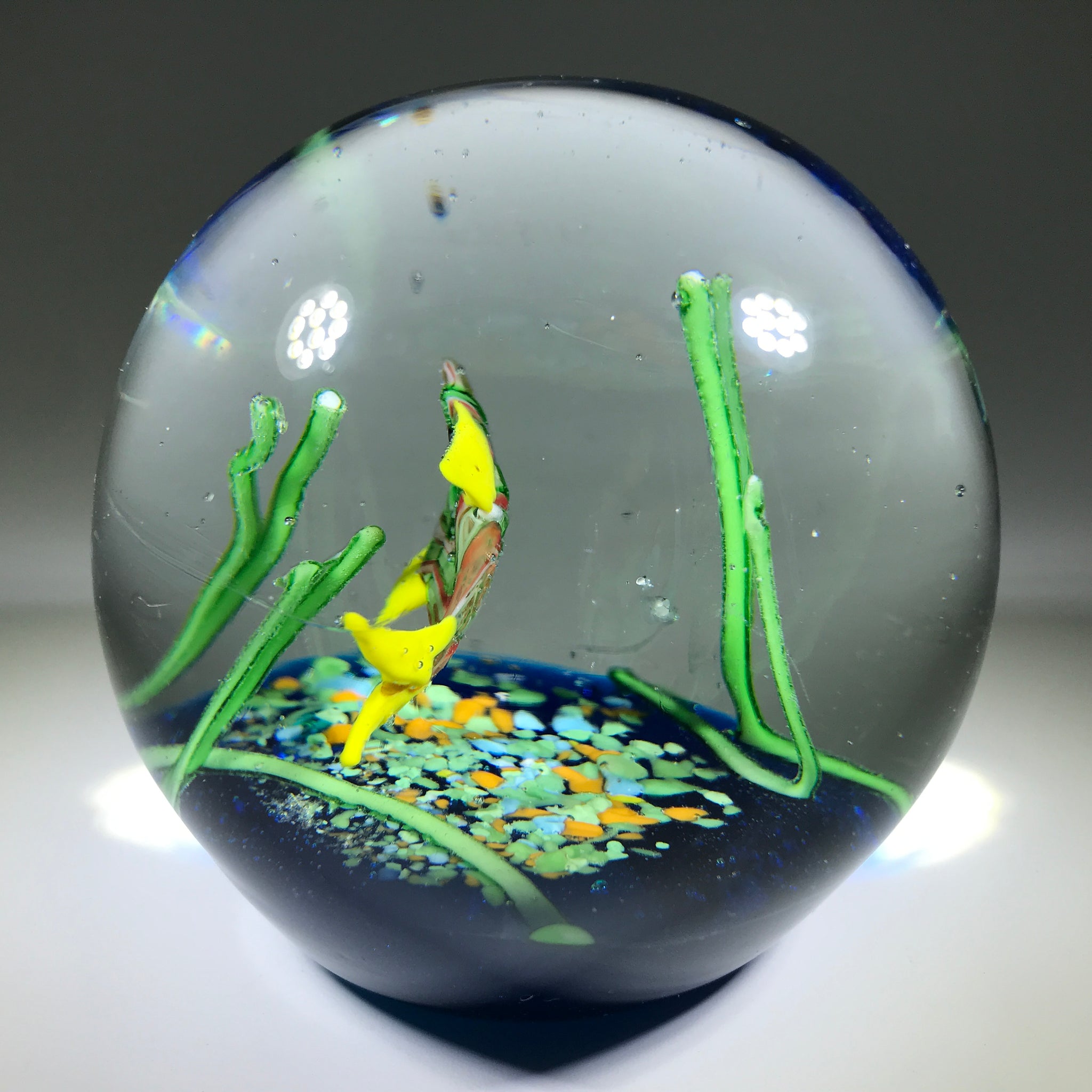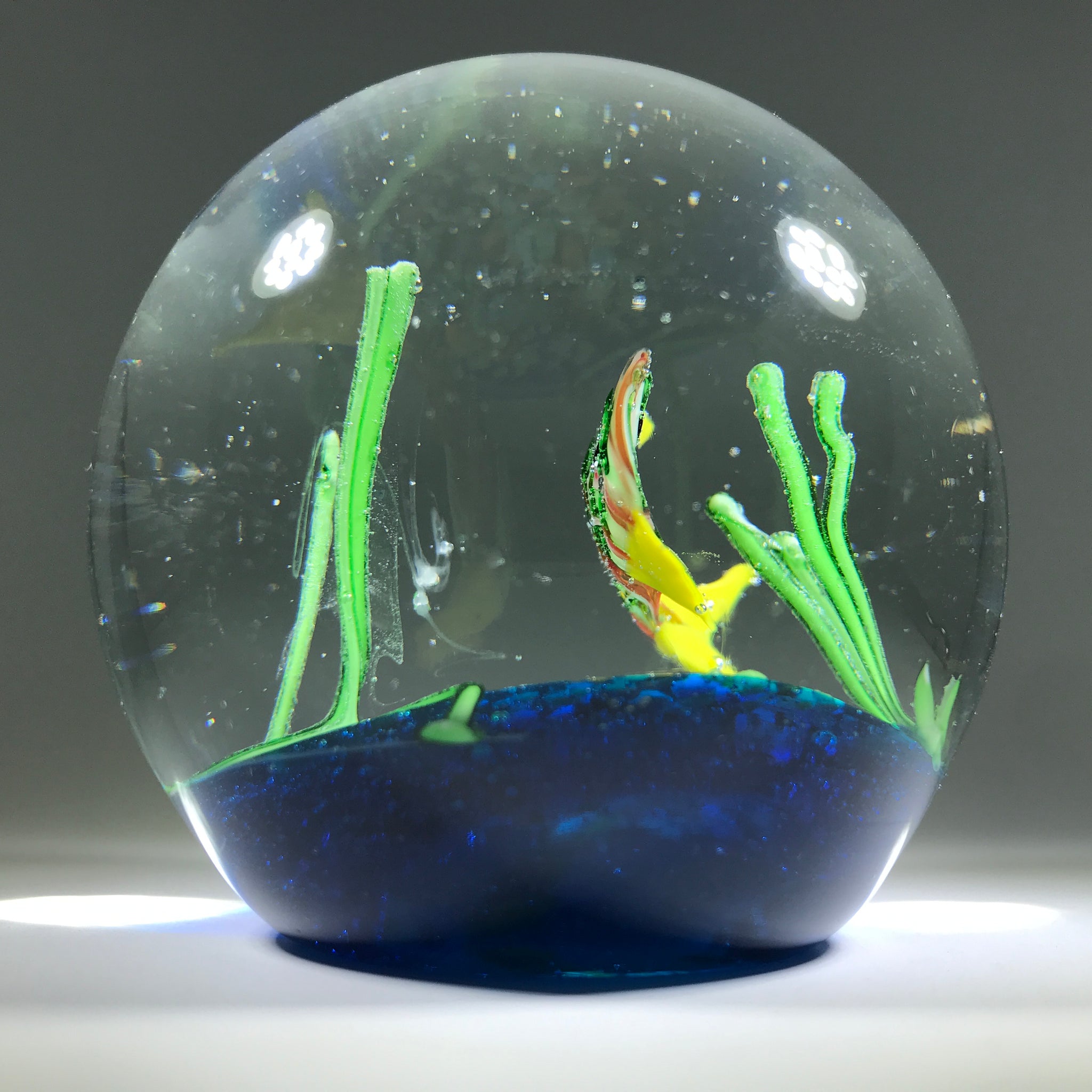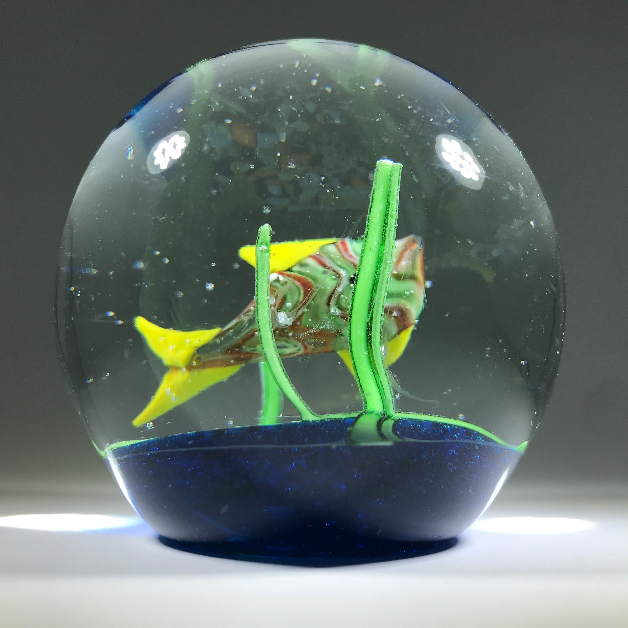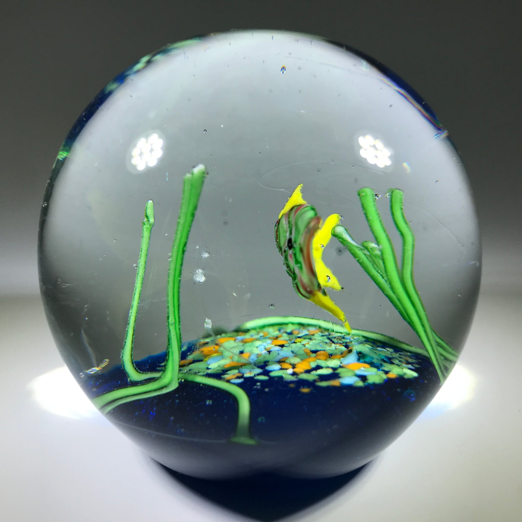 I nicely executed example with flat lamp work fish swimming through upright seagrass, over a speckled orange & green ground on a translucent blue ground.