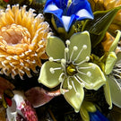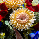A full double-sided bouquet thick with various strawflowers, blue yellow and red blossoms, and variegated orchids and detailed leaves tucked throughout the bouquet. A true master work from on of the most important contemporary glass artists.
