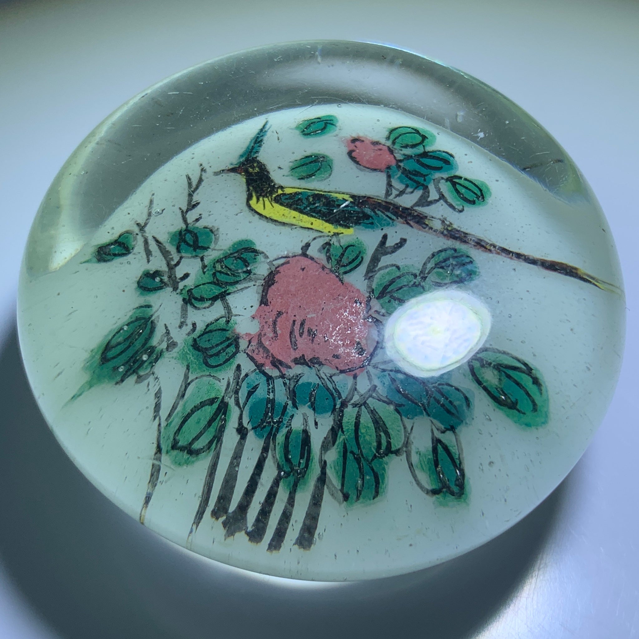 Early Chinese Art Glass Paperweight Hand Painted Black-Crested Bulbul Bird on White Ground