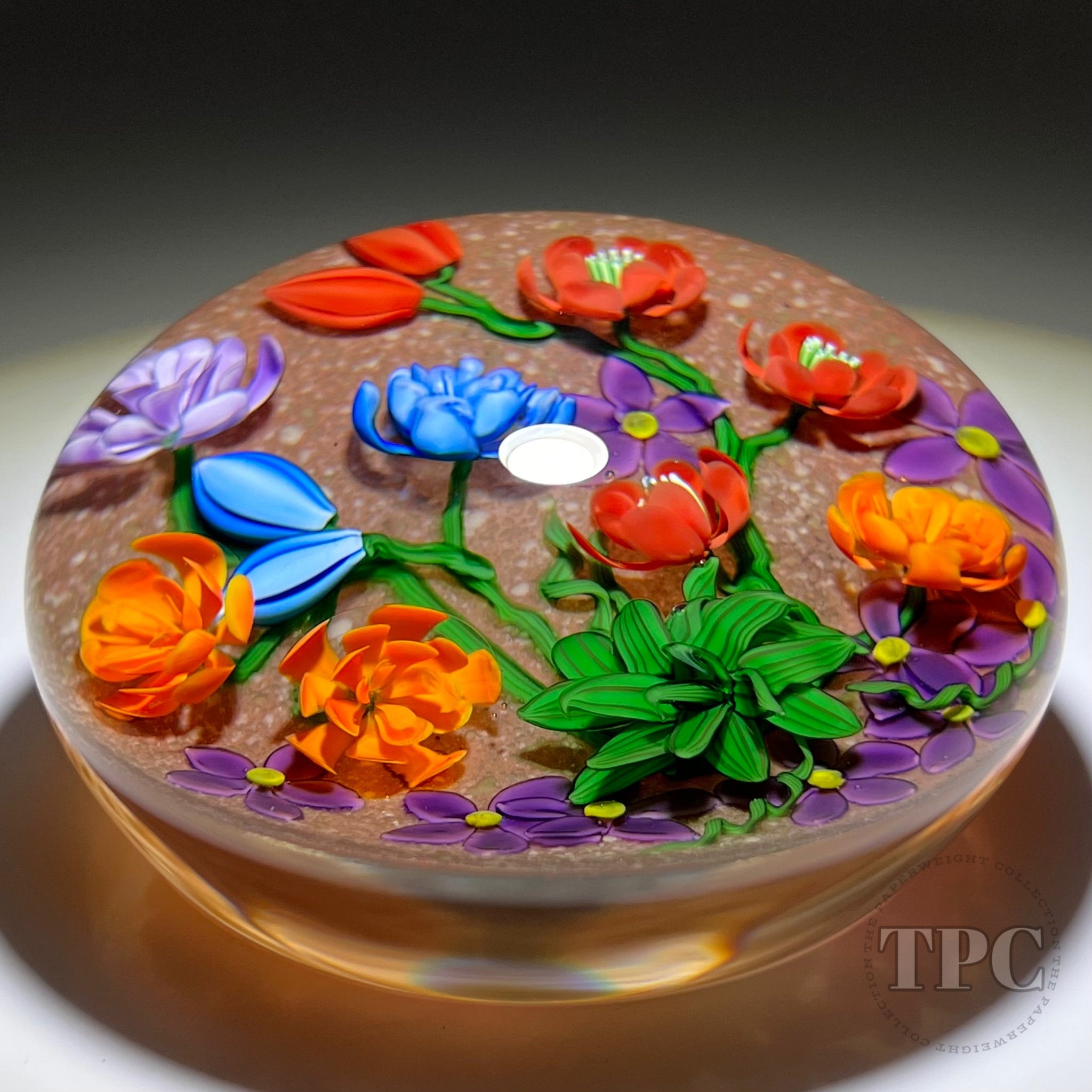 Early Ken Rosenfeld 1990 Glass Art Paperweight Flamework Floral Bouquet on Sand Ground