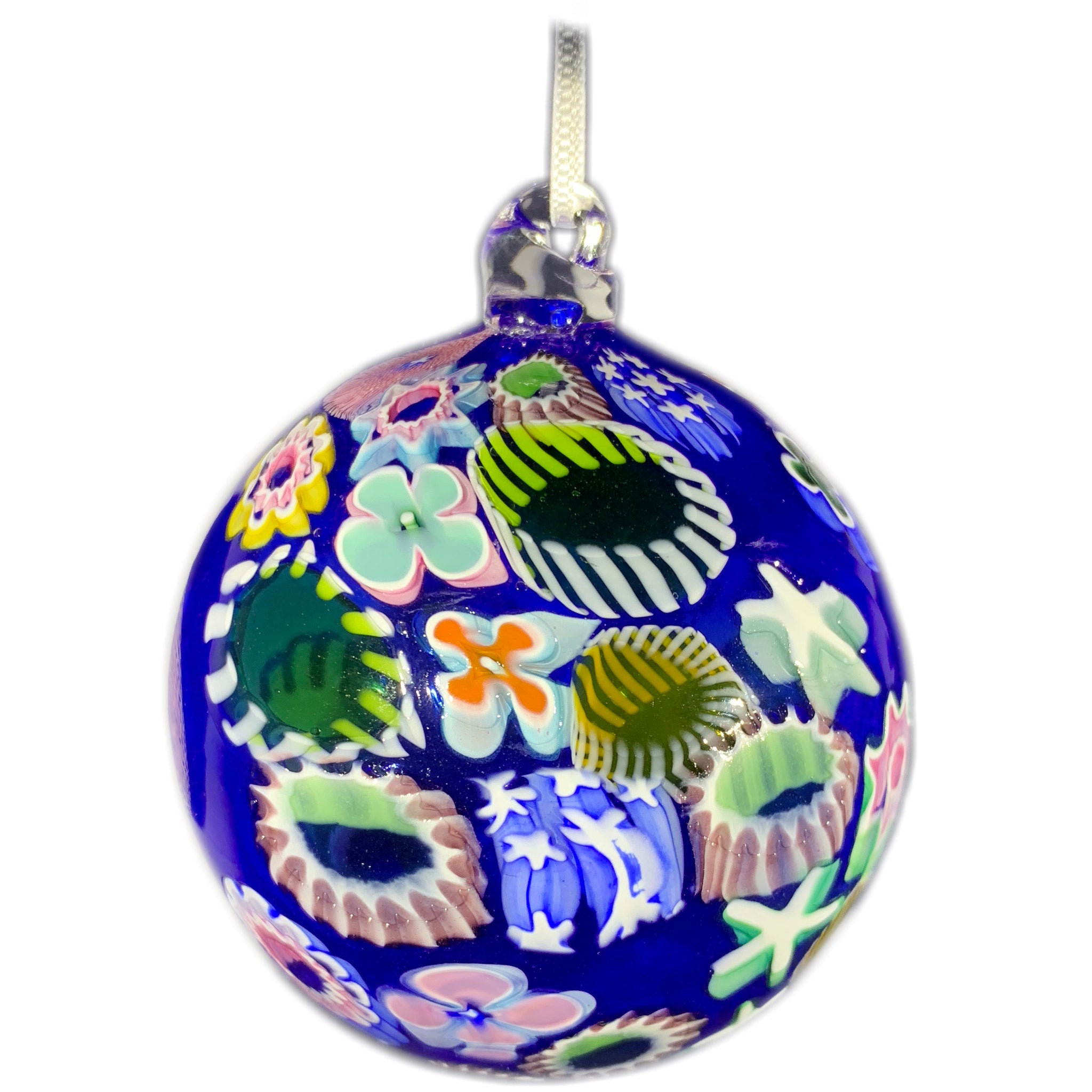 Each ornament measures roughly 3” in diameter and is generously scattered with a selection of millefiori cane sections set against a transparent blue field. No two ornaments are alike!
