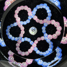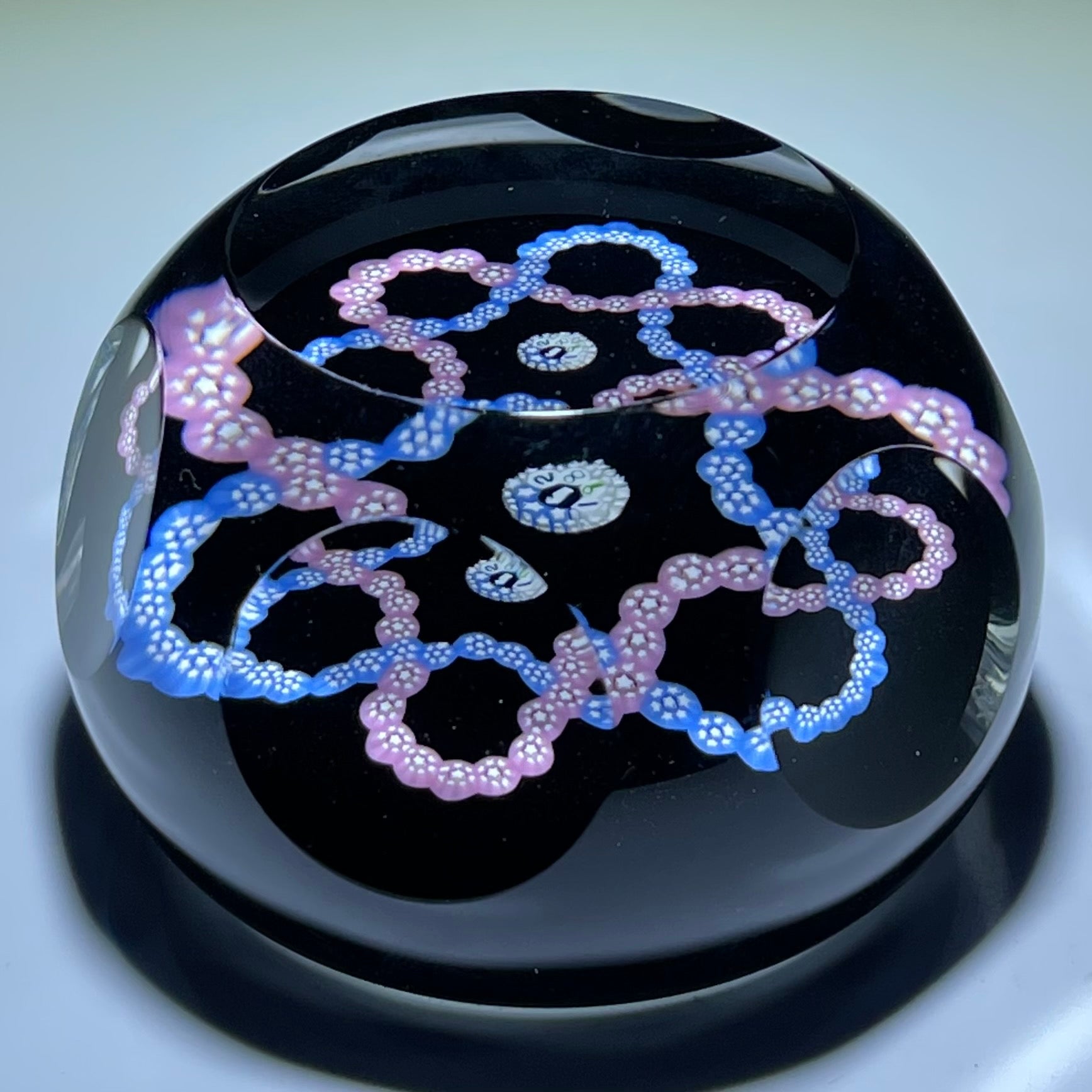 Interlaced trefoil garlands of pink and blue complex millefiori set over an opaque black ground.