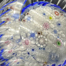 A subtle closepack design consisting of various complex white millefiori peppered with blues, pink, red and green framed by a stave basket with blue centered tube canes. The surface is finely finished with numerous narrow finger facets aligned vertically around the outside.