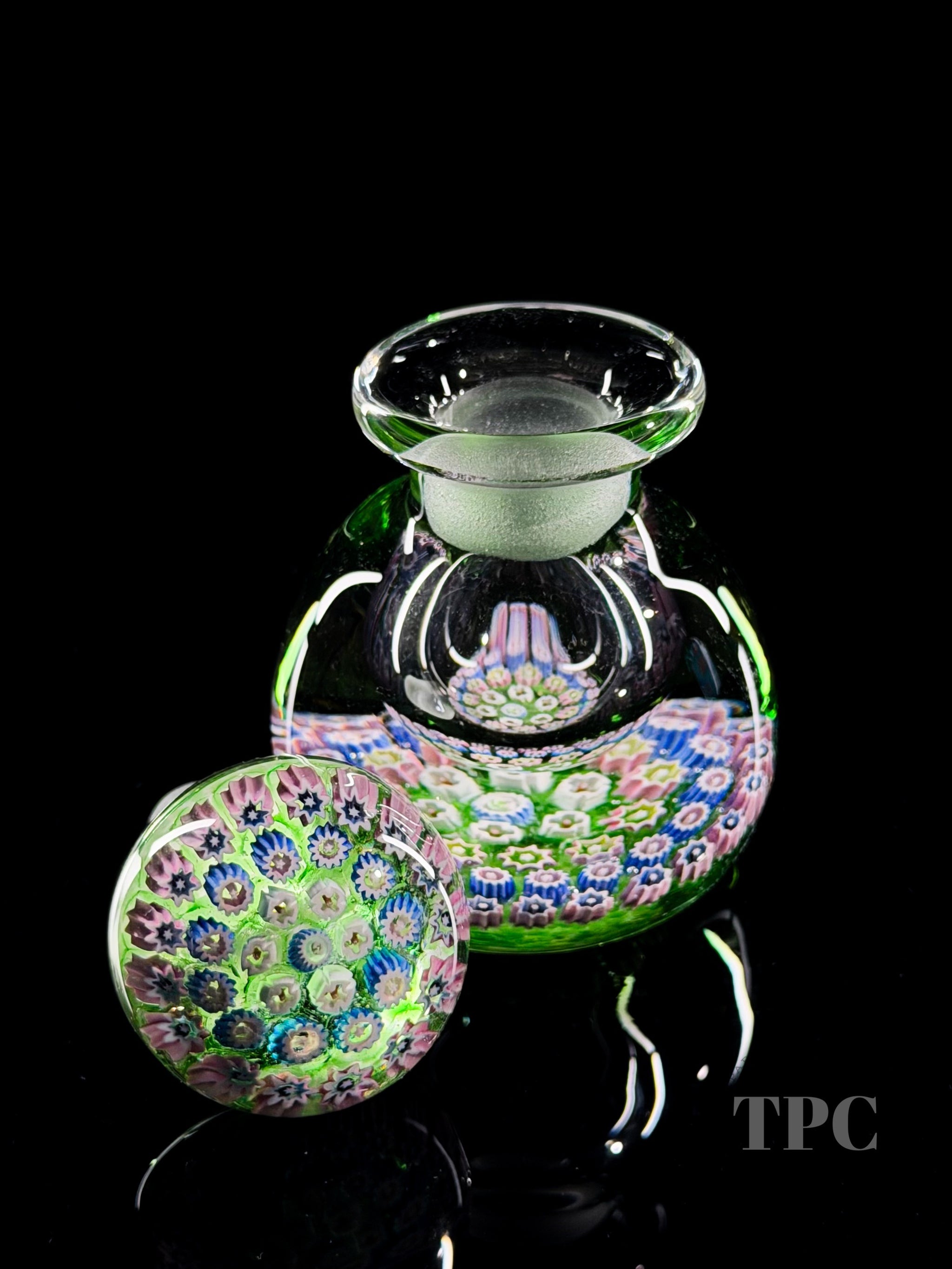 Colorful close concentric millefiori on translucent green ground with matching stopper.