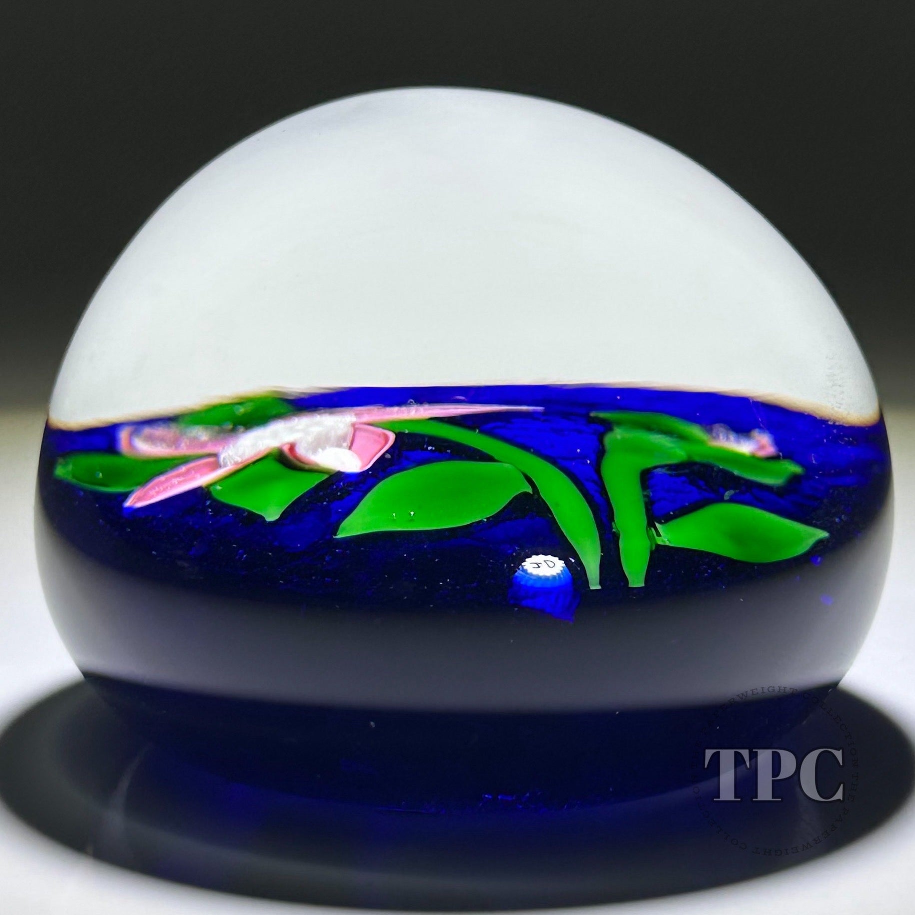 John Deacons Glass Art Paperweight Flamework Pink Flower on Blue