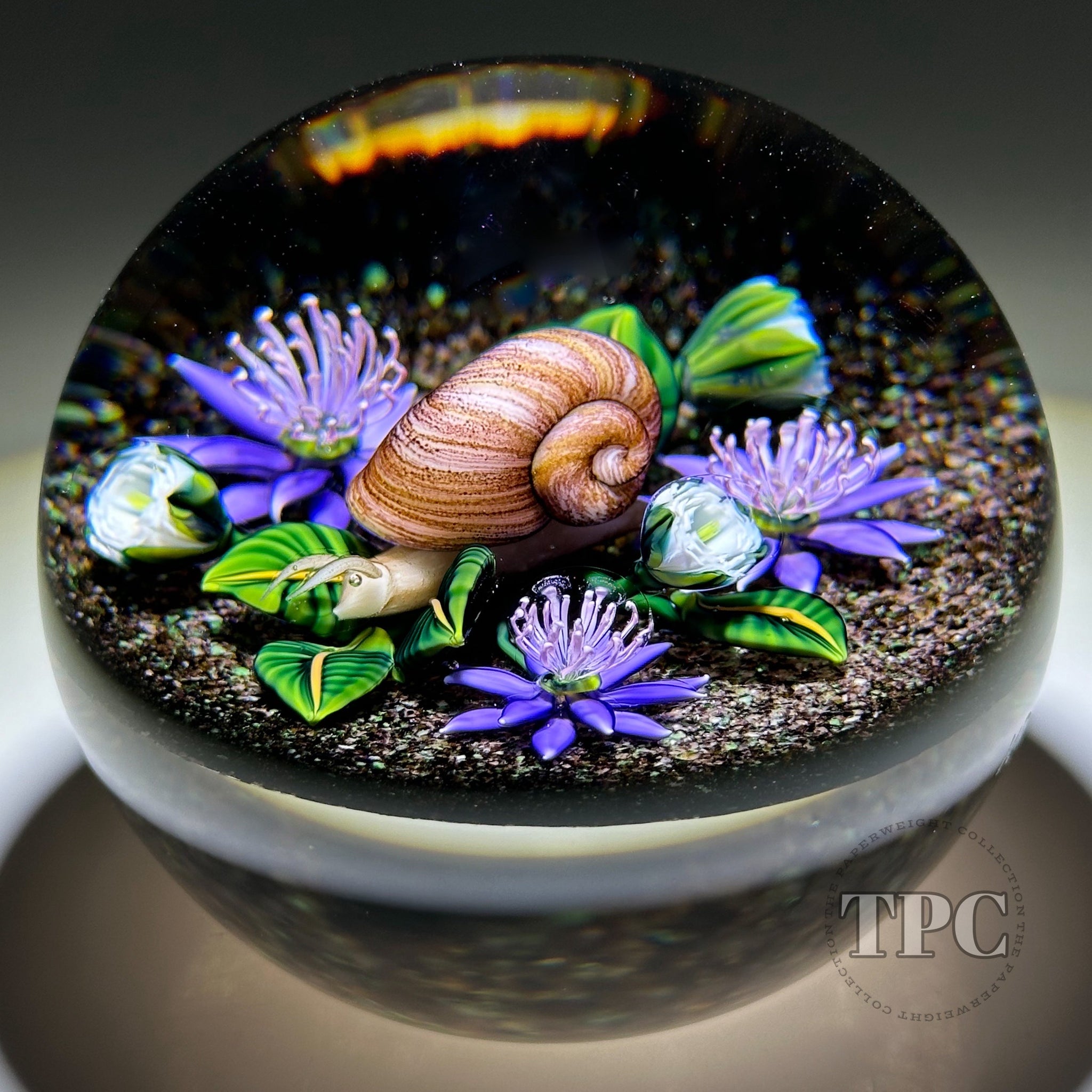 Ken Rosenfeld 2021 Glass Art Paperweight Flamework Snail with Purple Flowers and Clichy Roses