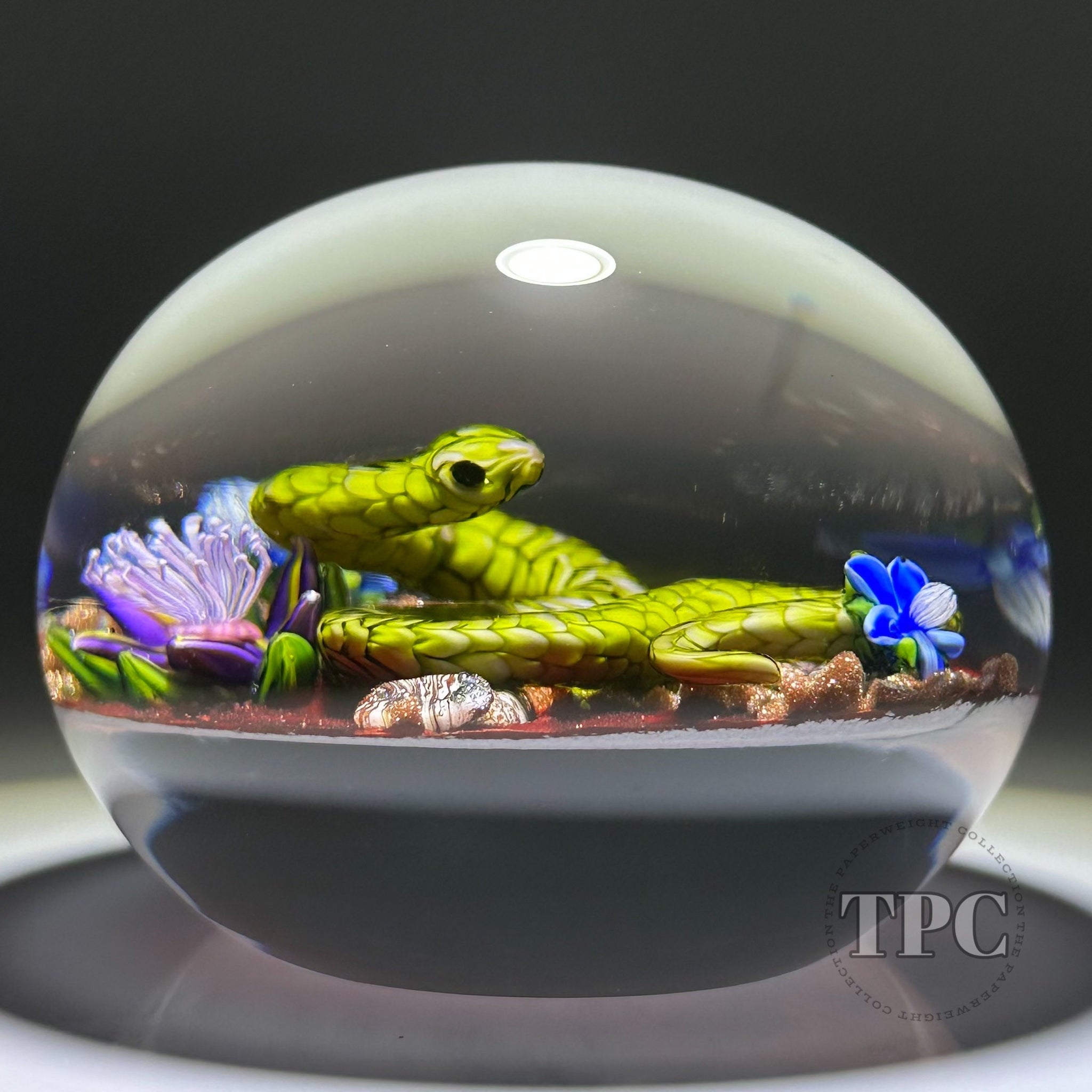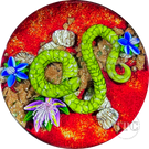 Ken Rosenfeld 2023 Glass Art Paperweight Flamework Green Scaled Snake on Red Sand with Pebbles, Aventurine, and Perennial Flowers