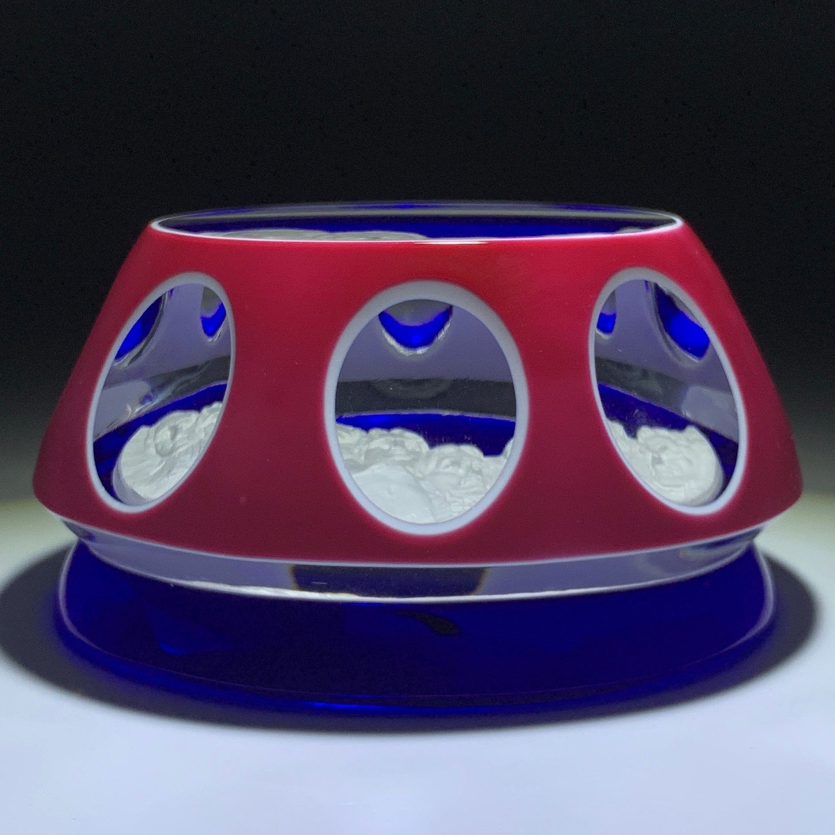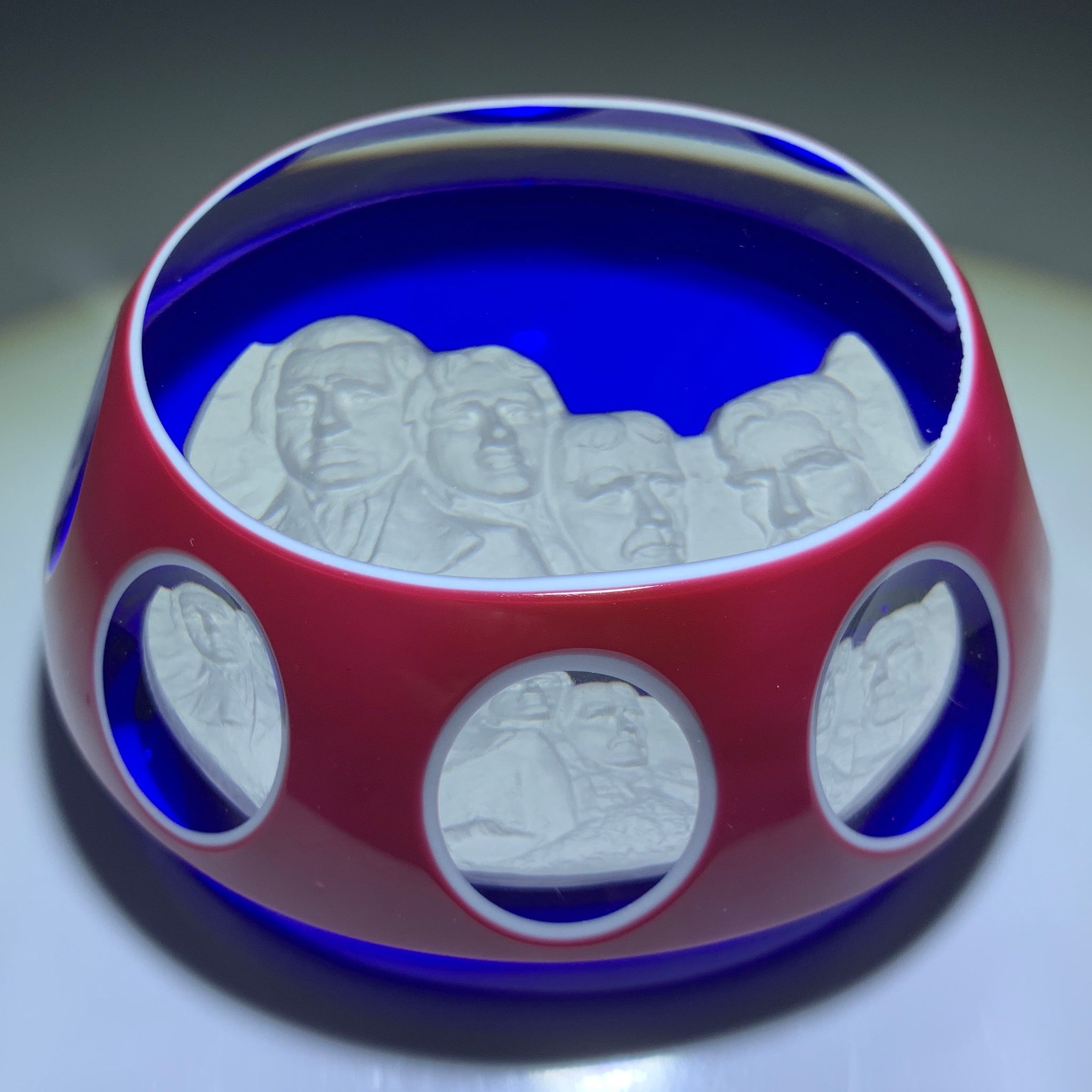 Made for the American bicentennial, this remains to be one of the most sought after (and large) modern production sulphide paperweights. It is executed in a ovoid shape with a detailed sulphide of Mount Rushmore set over a transparent blue ground, encapsulated in a faceted red over white double overlay.  Produced with a planned production run of 1000 pieces, only 789 were made.