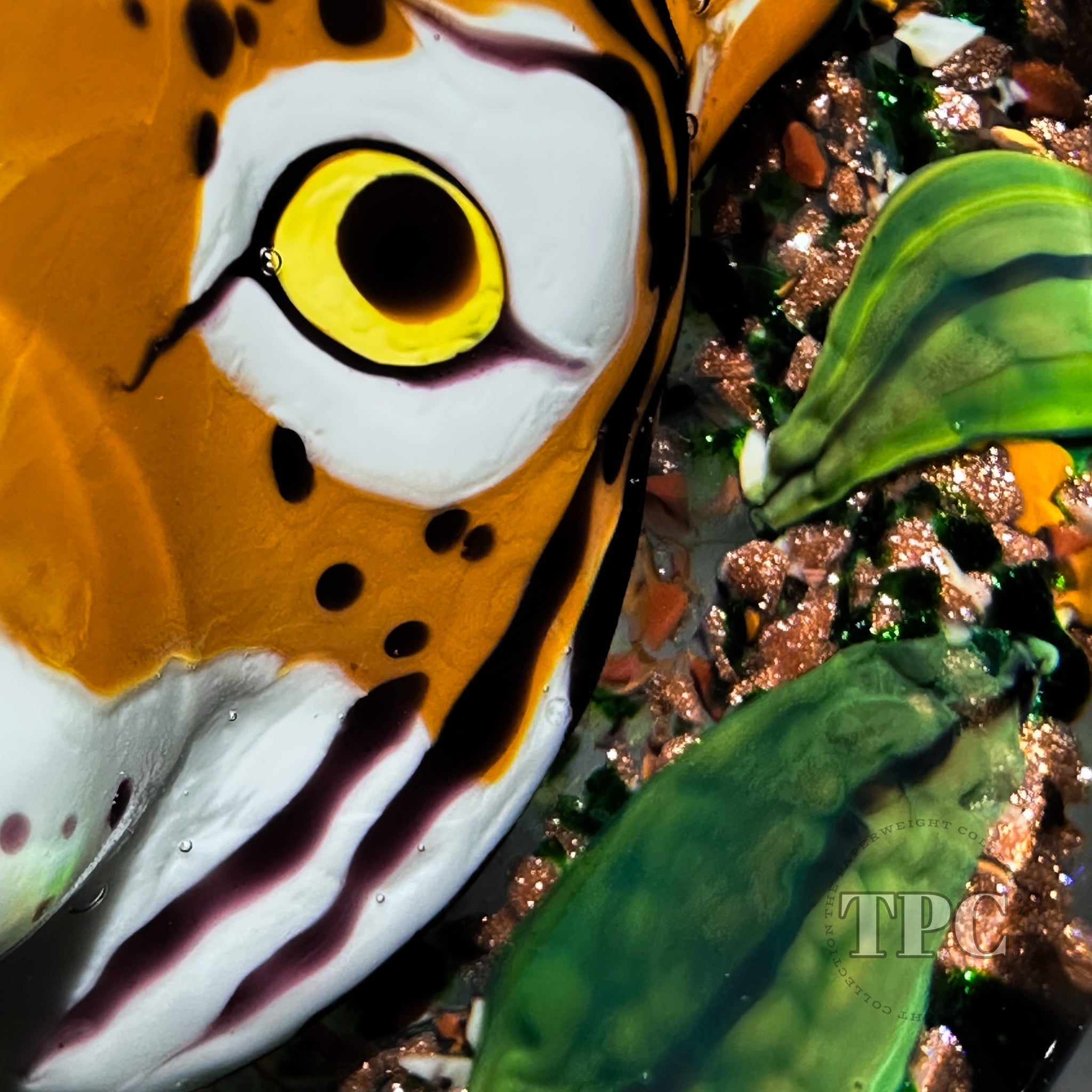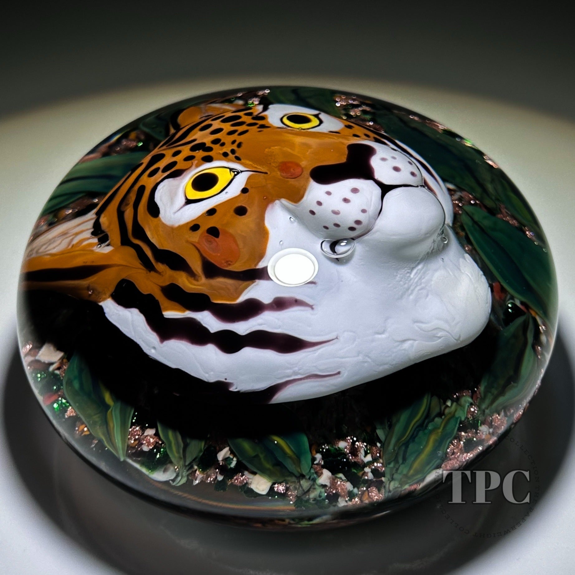 Loren Stump 2000 Glass Art Paperweight Flamework Tiger Bust on Green Leaves and Aventurine