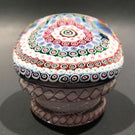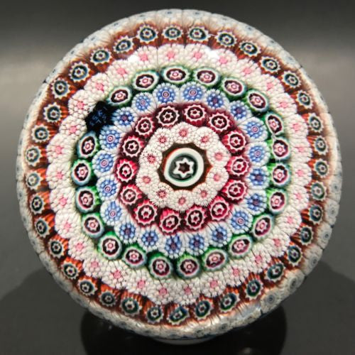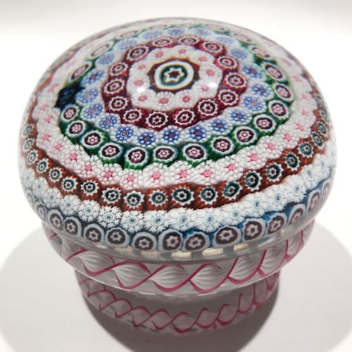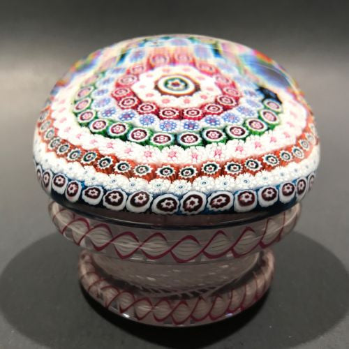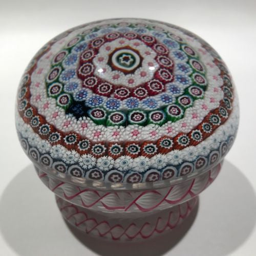 A very rare early modern peidouche with seven rows of concentric complex canes around a large center cane set on a stout white latticino pedestal with cords of red & white latticino around the base and between the seem of the pedestal and upper dome. Saint Louis paperweights from the 1950’s are very rare and only a handful of piedouches are known to exist; each one unique.