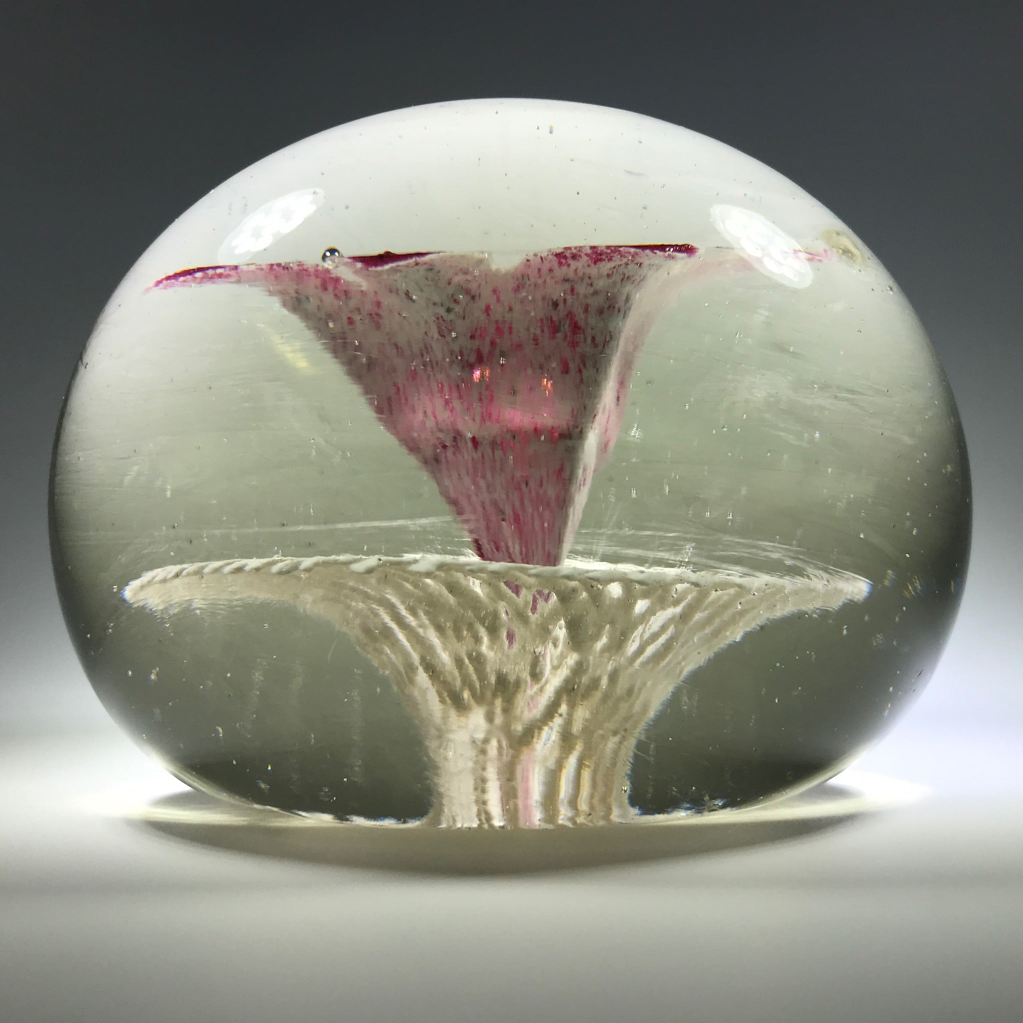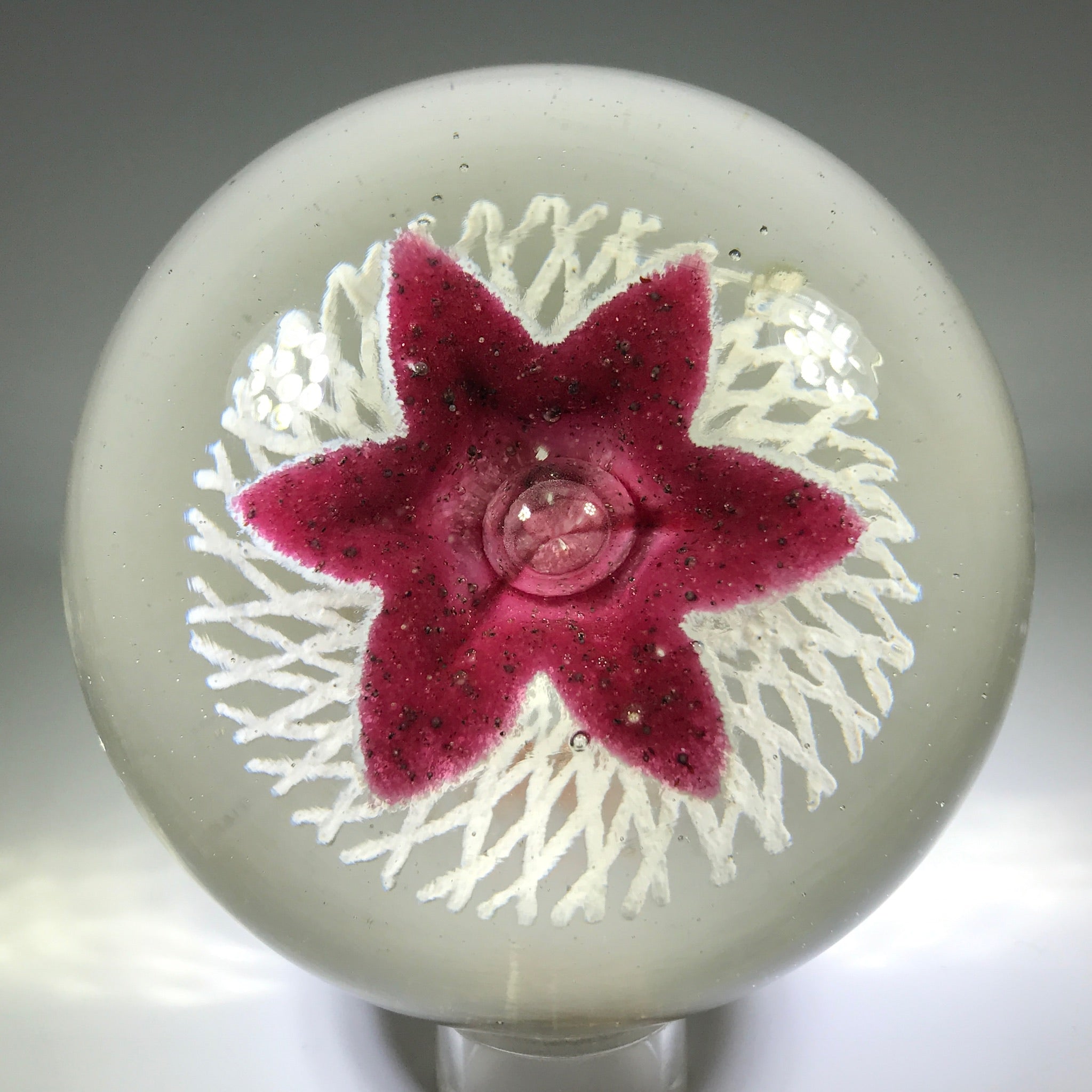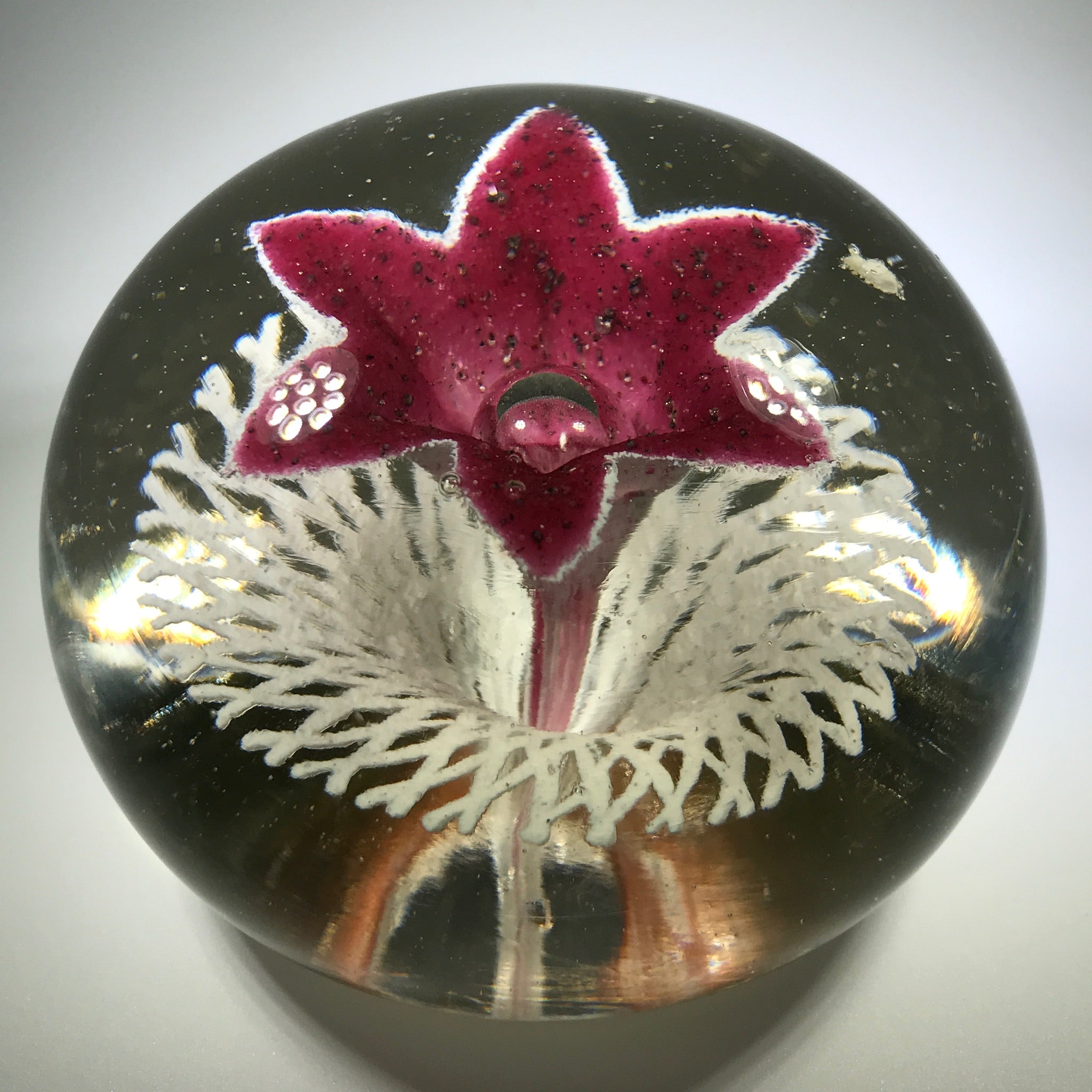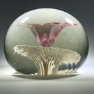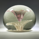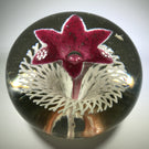 A very large rare design from an important early American paperweight artist. It features a large upright white lined maroon flower with a control bubble at the center. The flower hovers over an intricate frit lattice doily and the whole design is pulled to the base.